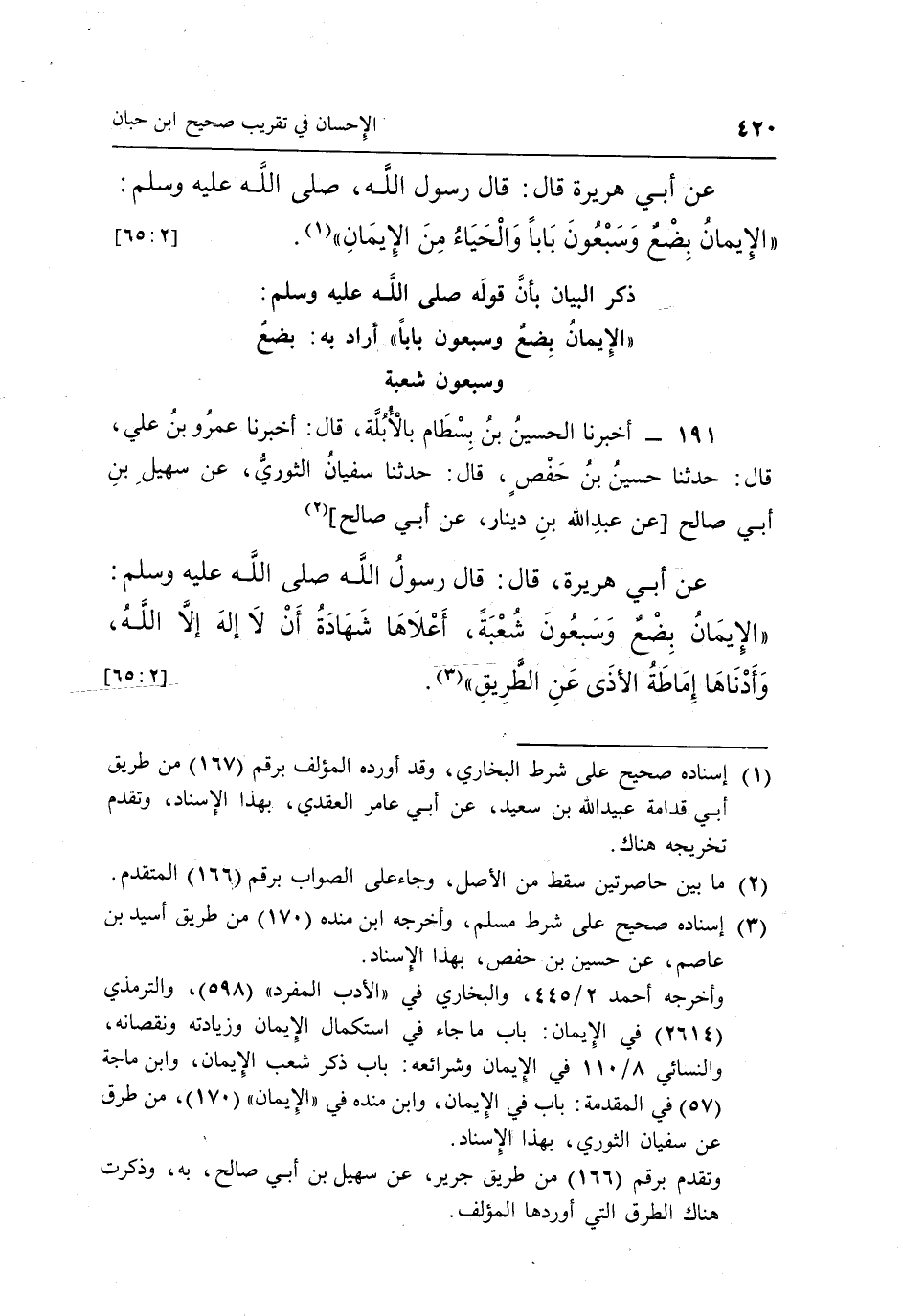 191 - أَخْبَرَنَا الْحُسَيْنُ بْنُ بِسْطَامٍ بِالْأُبُلَّةِ قَالَ أَخْبَرَنَا عَمْرُو بْنُ عَلِيٍّ قَالَ حَدَّثَنَا حُسَيْنُ بْنُ حَفْصٍ قَالَ حَدَّثَنَا سُفْيَانُ الثَّوْرِيُّ عَنْ سُهَيْلِ بْنِ أَبِي صَالِحٍ عَنْ [عَبْدِ اللَّهِ بْنِ دِينَارٍ عَنْ أَبِي صَالِحٍ] 1 عَنْ أَبِي هُرَيْرَةَ قَالَ: قَالَ رَسُولُ اللَّهِ صَلَّى اللَّهُ عَلَيْهِ وَسَلَّمَ: "الْإِيمَانُ بِضْعٌ وَسَبْعُونَ شُعْبَةً أَعْلَاهَا شَهَادَةُ أَنْ لَا إِلَهَ إِلَّا الله وأدناها إماطة الأذى عن الطريق"2. [65:2]