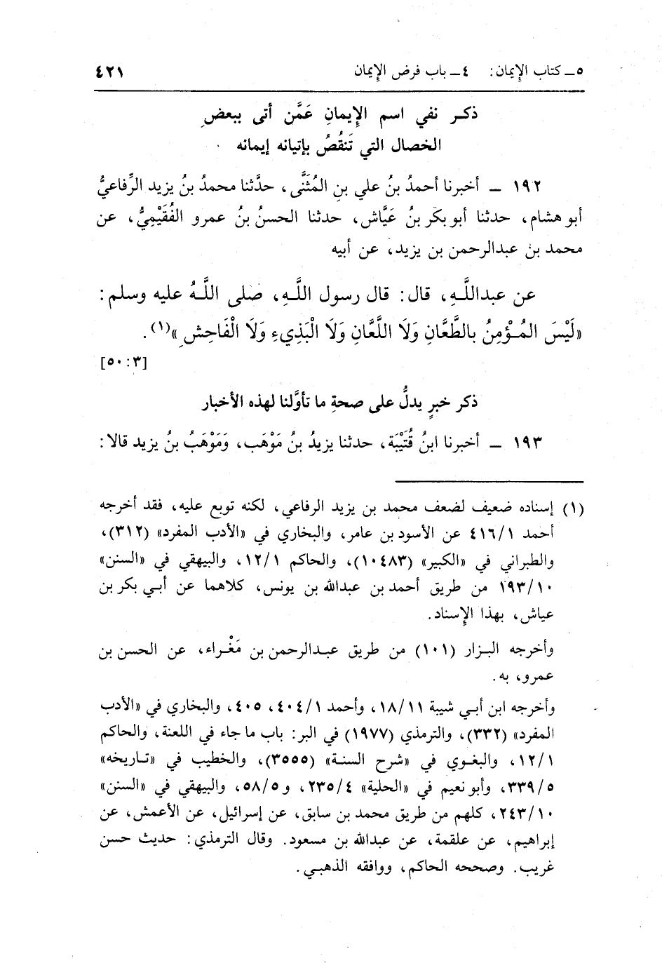 192 - أَخْبَرَنَا أَحْمَدُ بْنُ عَلِيِّ بْنِ الْمُثَنَّى حَدَّثَنَا مُحَمَّدُ بْنُ يَزِيدَ الرِّفَاعِيُّ أَبُو هِشَامٍ حَدَّثَنَا أَبُو بَكْرِ بْنُ عَيَّاشٍ حَدَّثَنَا الْحَسَنُ بْنُ عَمْرٍو الْفُقَيْمِيُّ عَنْ مُحَمَّدِ بْنِ عَبْدِ الرَّحْمَنِ بْنِ يَزِيدَ عَنْ أَبِيهِ عَنْ عَبْدِ اللَّهِ قَالَ قَالَ رَسُولُ اللَّهِ صَلَّى اللَّهُ عَلَيْهِ وسلم: "ليس الْمُؤْمِنُ بِالطَّعَّانِ وَلَا اللِّعَانِ وَلَا الْبَذِيءِ وَلَا الفاحش"1. [50:3]