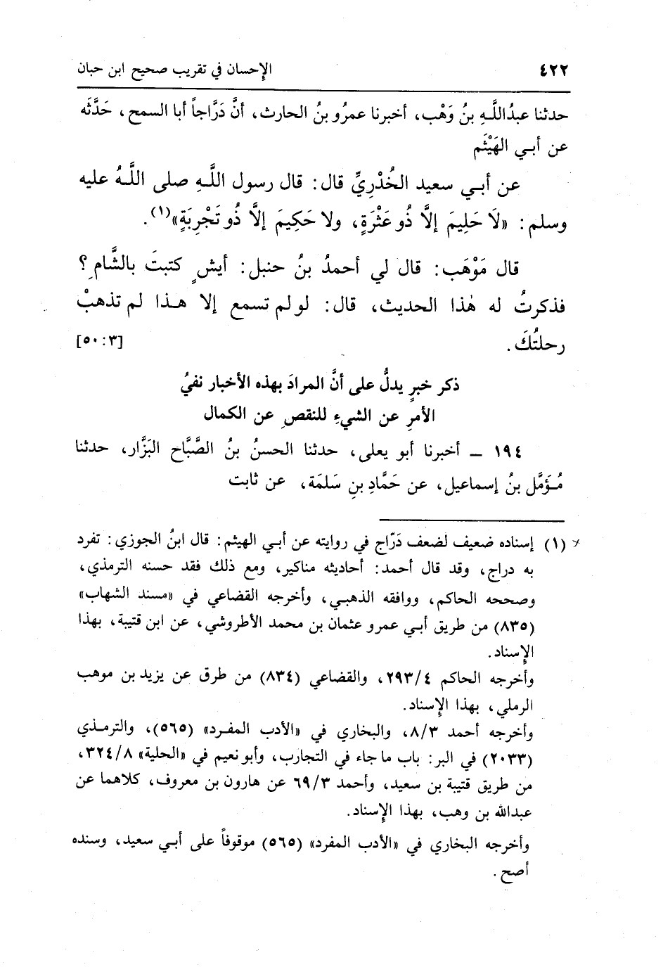 193 - أخبرنا بن قُتَيْبَةَ حَدَّثَنَا يَزِيدُ بْنُ مَوْهَبٍ وَمَوْهَبُ بْنُ يزيد قالاحدثنا عَبْدُ اللَّهِ بْنُ وَهْبٍ أَخْبَرَنَا عَمْرُو بْنُ الْحَارِثِ أَنَّ دَرَّاجًا أَبَا السَّمْحِ حَدَّثَهُ عَنْ أَبِي الْهَيْثَمِ عَنْ أَبِي سَعِيدٍ الْخُدْرِيِّ قَالَ: قَالَ رَسُولُ اللَّهِ صَلَّى اللَّهُ عَلَيْهِ وسلم: "لَا حَلِيمَ إِلَّا ذُو عَثْرَةٍ وَلَا حَكِيمَ إِلَّا ذُو تَجْرِبَةٍ"1.