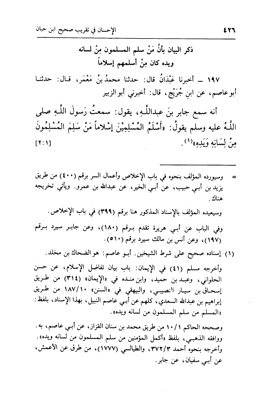 197 - أَخْبَرَنَا عَبْدَانُ قَالَ حَدَّثَنَا مُحَمَّدُ بْنُ مَعْمَرٍ قَالَ حَدَّثَنَا أبو عاصم عن بن جُرَيْجٍ قَالَ أَخْبَرَنِي أَبُو الزُّبَيْرِ أَنَّهُ سَمِعَ جَابِرَ بْنَ عَبْدِ اللَّهِ يَقُولُ: سَمِعْتُ رَسُولَ اللَّهِ صَلَّى اللَّهُ عَلَيْهِ وَسَلَّمَ يَقُولُ: "أَسْلَمُ الْمُسْلِمِينَ إِسْلَامًا مَنْ سَلِمَ الْمُسْلِمُونَ مِنْ لِسَانِهِ ويده"1. [2:1]