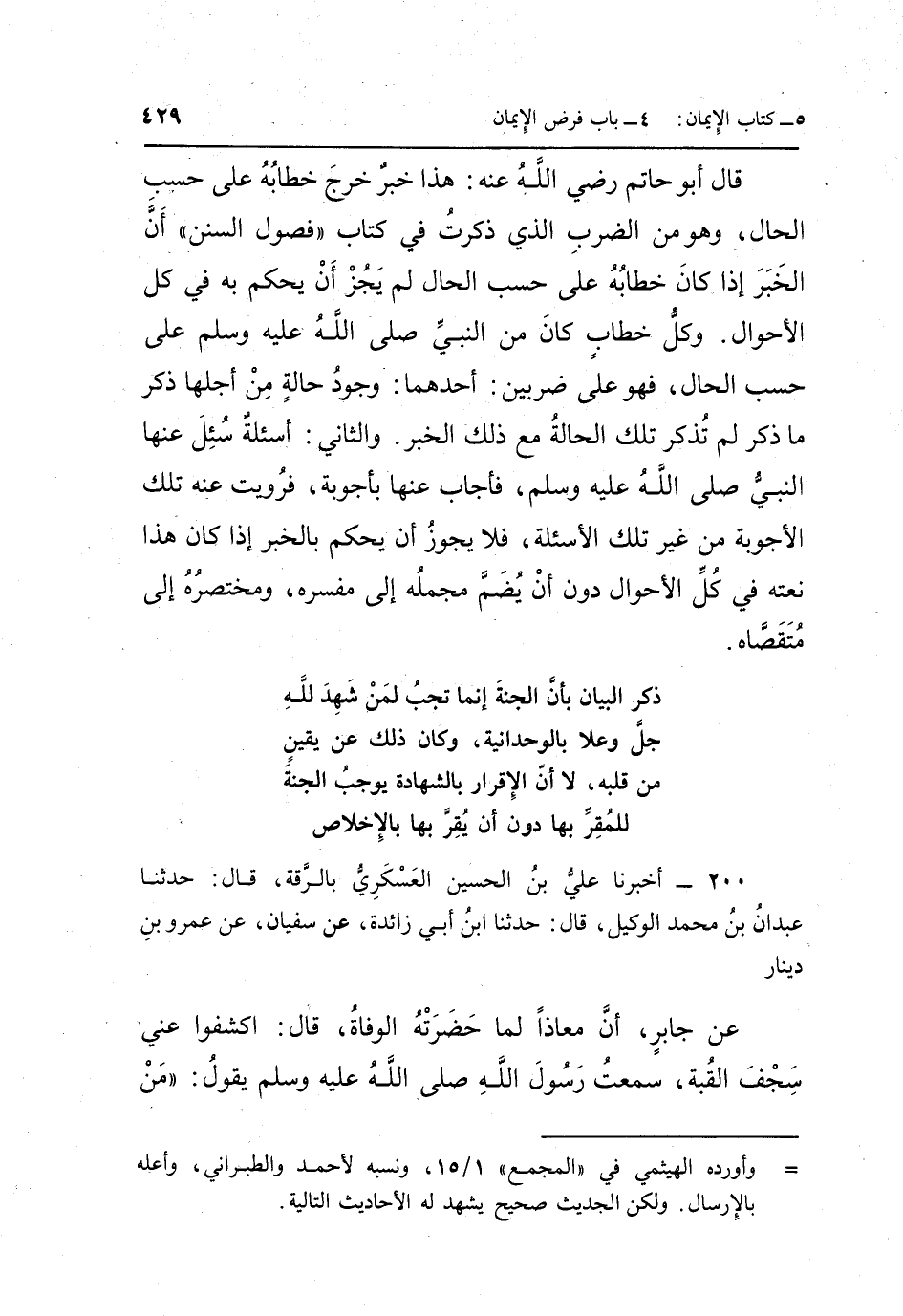 200 - أَخْبَرَنَا عَلِيُّ بْنُ الْحُسَيْنِ الْعَسْكَرِيُّ بِالرَّقَّةِ قَالَ حَدَّثَنَا عَبْدَانُ بْنُ مُحَمَّدٍ الْوَكِيلُ قَالَ حَدَّثَنَا بن أَبِي زَائِدَةَ عَنْ سُفْيَانَ عَنْ عَمْرِو بْنِ دِينَارٍ عَنْ جَابِرٍ: أَنَّ مُعَاذًا لَمَّا حَضَرَتْهُ الْوَفَاةُ قَالَ: اكْشِفُوا عَنِّي سِجْفَ الْقُبَّةِ سَمِعْتُ رَسُولَ اللَّهِ صَلَّى اللَّهُ عَلَيْهِ وَسَلَّمَ يقول: "منذكر الْبَيَانِ بِأَنَّ الْجَنَّةَ إِنَّمَا تَجِبُ لِمَنْ شَهِدَ لِلَّهِ جَلَّ وَعَلَا بِالْوَحْدَانِيَّةِ وَكَانَ ذَلِكَ عَنْ يَقِينٍ مِنْ قَلْبِهِ لَا أَنَّ الْإِقْرَارَ بِالشَّهَادَةِ يُوجِبُ الْجَنَّةَ لِلْمُقِرِّ بِهَا دُونَ أَنْ يُقِرَّ بِهَا بِالْإِخْلَاصِ