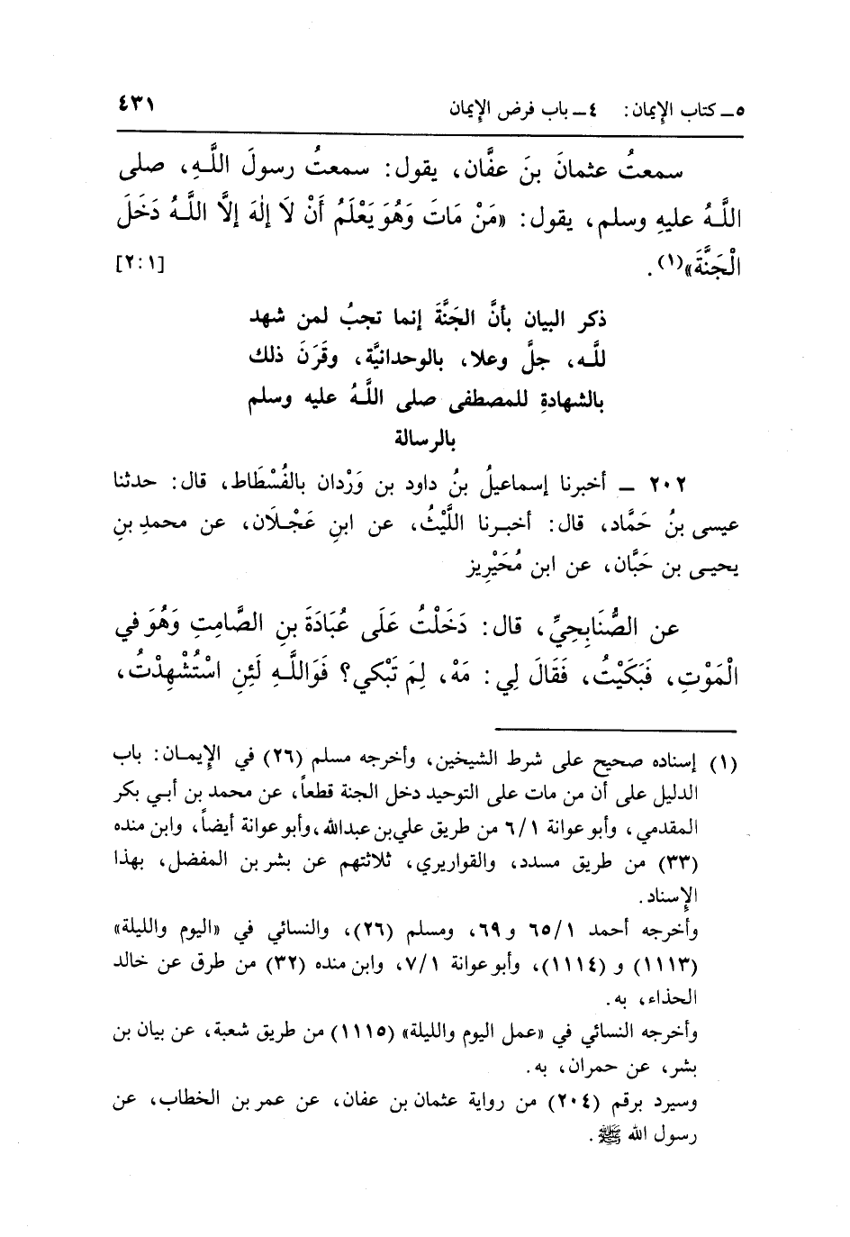 202 - أَخْبَرَنَا إِسْمَاعِيلُ بْنُ دَاوُدَ بْنِ وَرْدَانَ بِالْفُسْطَاطِ قَالَ حَدَّثَنَا عِيسَى بْنُ حَمَّادٍ قَالَ أَخْبَرَنَا الليث عن بن عَجْلَانَ عَنْ مُحَمَّدِ بْنِ يَحْيَى بْنِ حَبَّانَ عَنْ بن مُحَيْرِيزٍ عَنِ الصُّنَابِحِيِّ قَالَ: دَخَلْتُ عَلَى عُبَادَةَ بْنِ الصَّامِتِ وَهُوَ فِي الْمَوْتِ فَبَكَيْتُ فَقَالَ لي: مه لم تبكي فوالله لئن استشهدتذكر الْبَيَانِ بِأَنَّ الْجَنَّةَ إِنَّمَا تَجِبُ لِمَنْ شَهِدَ لِلَّهِ جَلَّ وَعَلَا بِالْوَحْدَانِيَّةِ وَقَرَنَ ذَلِكَ بِالشَّهَادَةِ لِلْمُصْطَفَى صَلَّى اللَّهُ عَلَيْهِ وَسَلَّمَ بِالرِّسَالَةِ