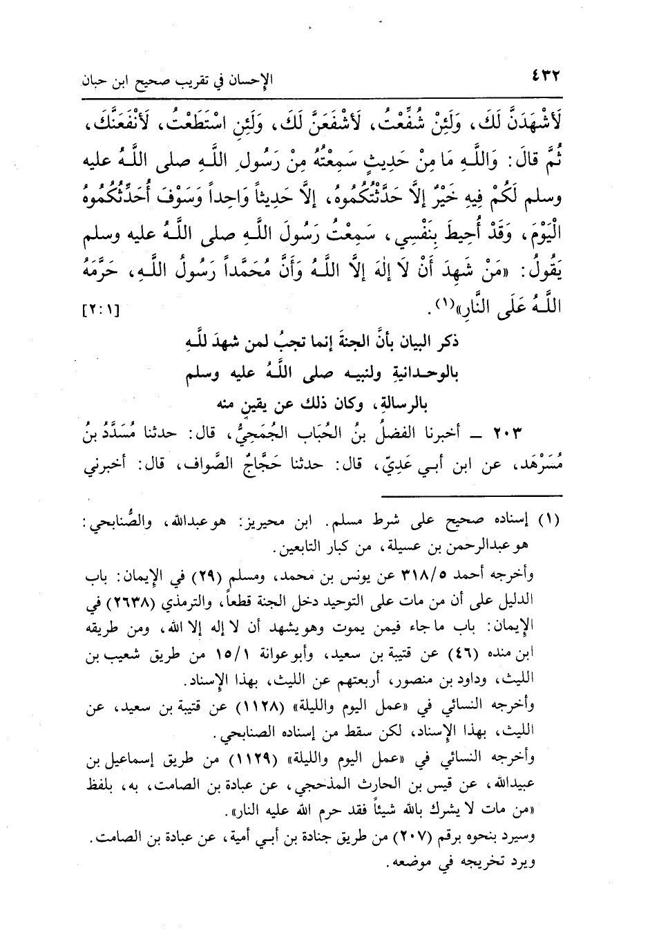 203 - أَخْبَرَنَا الْفَضْلُ بْنُ الْحُبَابِ الْجُمَحِيُّ قَالَ حَدَّثَنَا مسدد بن مسرهد عن بن أَبِي عَدِيٍّ قَالَ حَدَّثَنَا حَجَّاجٌ الصَّوَّافُ قَالَ: أخبرنيذكر الْبَيَانِ بِأَنَّ الْجَنَّةَ إِنَّمَا تَجِبُ لِمَنْ شَهِدَ لِلَّهِ بِالْوَحْدَانِيَّةِ وَلِنَبِيِّهِ صَلَّى اللَّهُ عَلَيْهِ وَسَلَّمَ بِالرِّسَالَةِ وَكَانَ ذَلِكَ عَنْ يَقِينٍ مِنْهُ