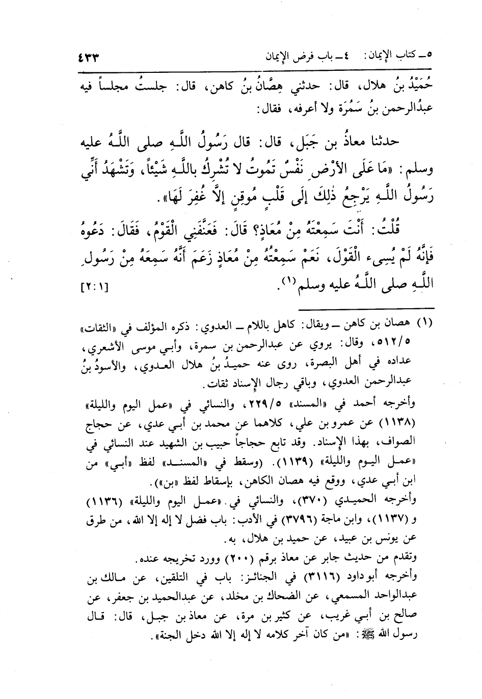 حُمَيْدُ بْنُ هِلَالٍ قَالَ حَدَّثَنِي هِصَّانُ بْنُ كَاهِنٍ قَالَ جَلَسْتُ مَجْلِسًا فِيهِ عَبْدُ الرَّحْمَنِ بْنُ سَمُرَةَ وَلَا أَعْرِفُهُ فَقَالَ: حَدَّثَنَا مُعَاذُ بْنَ جَبَلٍ قَالَ: قَالَ رَسُولُ اللَّهِ صَلَّى اللَّهُ عَلَيْهِ وَسَلَّمَ: "مَا عَلَى الْأَرْضِ نَفْسٌ تَمُوتُ لَا تُشْرِكُ بِاللَّهِ شَيْئًا وَتَشْهَدُ أَنِّي رَسُولُ اللَّهِ يَرْجِعُ ذَلِكَ إِلَى قَلْبٍ مُوقِنٍ إِلَّا غُفِرَ لَهَا".