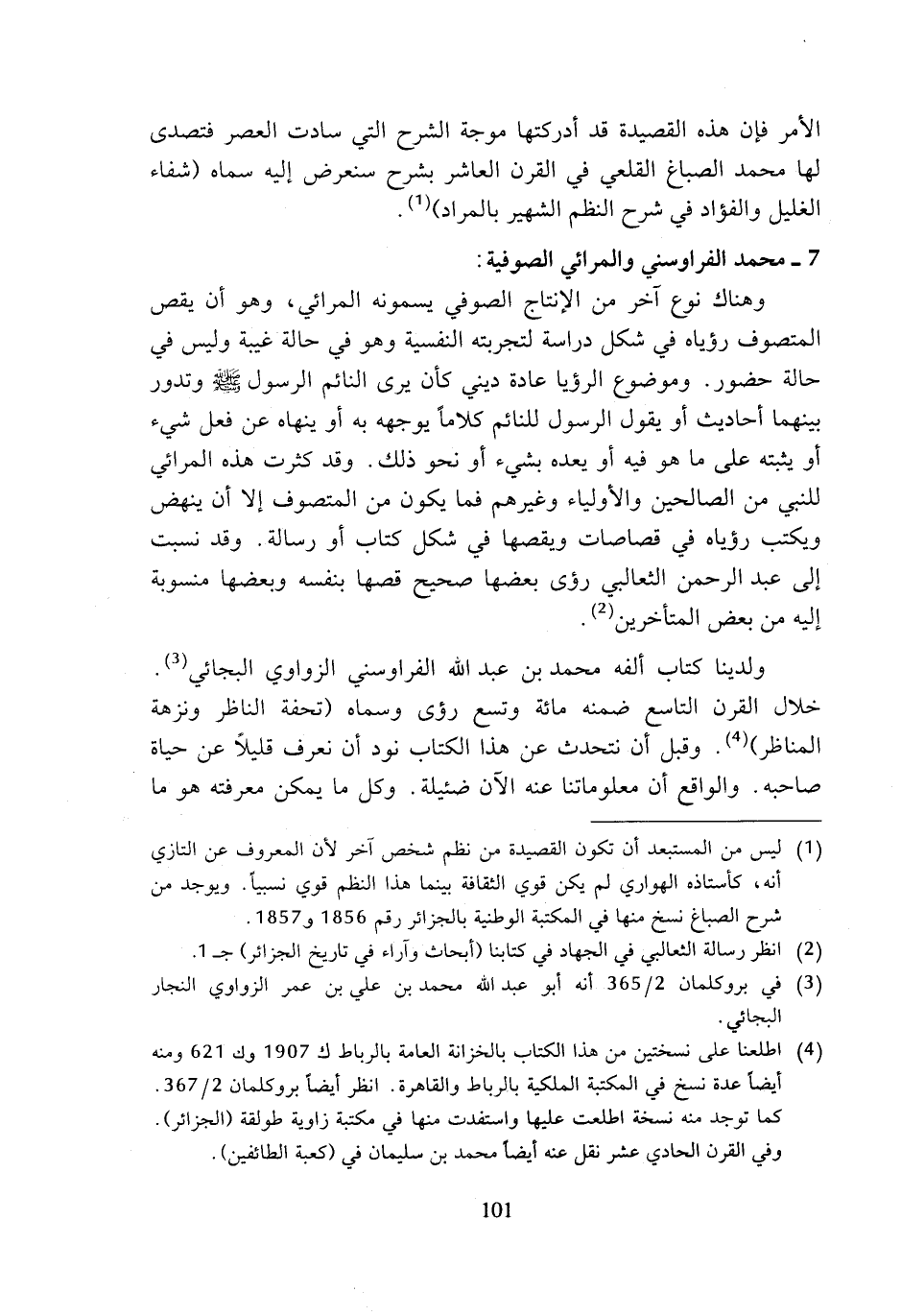 (¬4) اطلعنا على نسختين من هذا الكتاب بالخزانة العامة بالرباط ك 1907 وك 621 ومنه أيضا عدة نسخ في المكتبة الملكية بالرباط والقاهرة. انظر أيضا بروكلمان 2/ 367. كما توجد منه نسخة اطلعت عليها واستفدت منها في مكتبة زاوية طولقة (الجزائر). وفي القرن الحادي عشر نقل عنه أيضا محمد بن سليمان في (كعبة الطائفين).