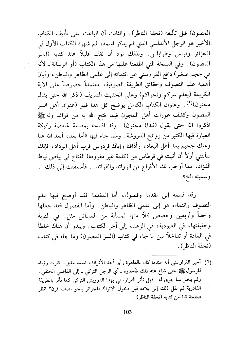 المصون) قبل تأليفه (تحفة الناظر). والثالث أن الباعث على تأليف الكتاب الأخير هو الرجل الأندلسي الذي لم يذكر اسمه، ثم شهرة الكتاب الأول في الجزائر وتونس وطرابلس. ولذلك نود أن نقف قليلا عند كتابه (السر المصون). وفي النسخة التي اطلعنا عليها من هذا الكتاب (أو الرسالة - لأنه في حجم صغير) دافع الفراوسني عن انتمائه إلى علمي الظاهر والباطن، وأبان أهمية علم التصوف وحقائق الطريقة الصوفية، معتمدا خصوصا على الآية الكريمة {يعلم سركم ونجواكم} وعلى الحديث الشريف (اذكر الله حتى يقال مجنون) (¬1). وعنوان الكتاب الكامل يوضح كل هذا فهو (عنوان أهل السر المصون وكشف عورات أهل المجون فيما فتح الله به من فوائد وله (صلى الله عليه وسلم) اذكروا الله حتى يقول (كذا) مجنون). وقد افتتحه بمقدمة غامضة ركيكة العبارة فيها الكثير من روائح الدروشة. ومما جاء فيها (أما بعد، أبعد الله عنا وعنك جحيم بعد أهل البعاد، وأذاقنا وإياك فردوس قرب أهل الوداد، فإنك سألتني أولا أن أثبت في قرطاس من (كلمة غير مقروءة) الفتاح في بياض نياط الفؤاد، مما أوجب لك الأفراح من الزوائد والفوائد .. فأسعفتك إلى ذلك ..