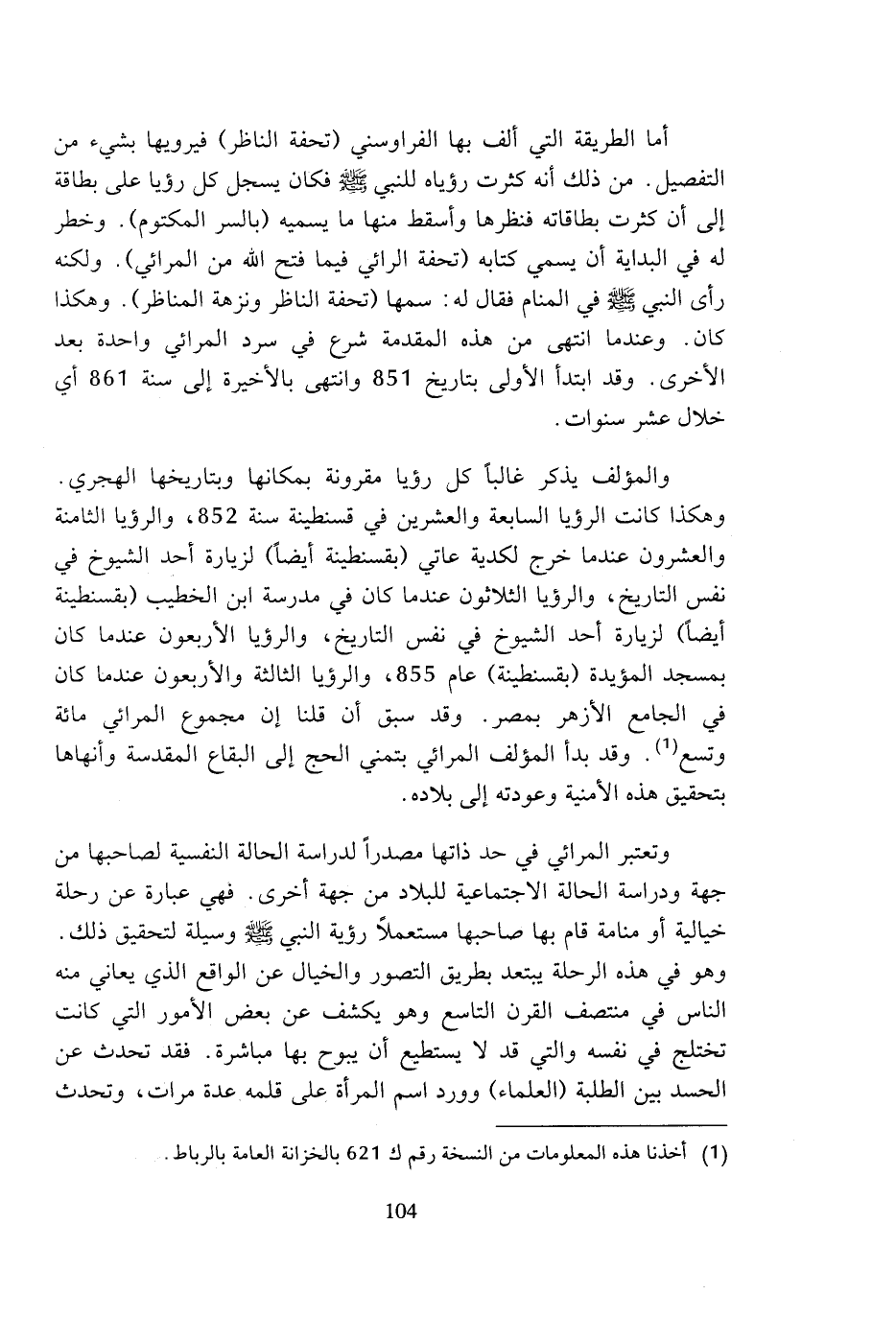 والمؤلف يذكر غالبا كل رؤيا مقرونة بمكانها وبتاريخها الهجري. وهكذا كانت الرؤيا السابعة والعشرين في قسنطينة سنة 852، والرؤيا الثامنة والعشرون عندما خرج لكدية عاتي (بقسنطينة أيضا) لزيارة أحد الشيوخ في نفس التاريخ، والرؤيا الثلاثون عندما كان في مدرسة ابن الخطيب (بقسنطينة أيضا) لزيارة أحد الشيوخ في نفس التاريخ، والرؤيا الأربعون عندما كان بمسجد المؤيدة (بقسنطينة) عام 855، والرؤيا الثالثة والأربعون عندما كان في الجامع الأزهر بمصر. وقد سبق أن قلنا إن مجموع المرائي مائة وتسع (¬1). وقد بدأ المؤلف المرائي بتمني الحج إلى البقاع المقدمة وأنهاها بتحقيق هذه الأمنية وعودته إلى بلاده.