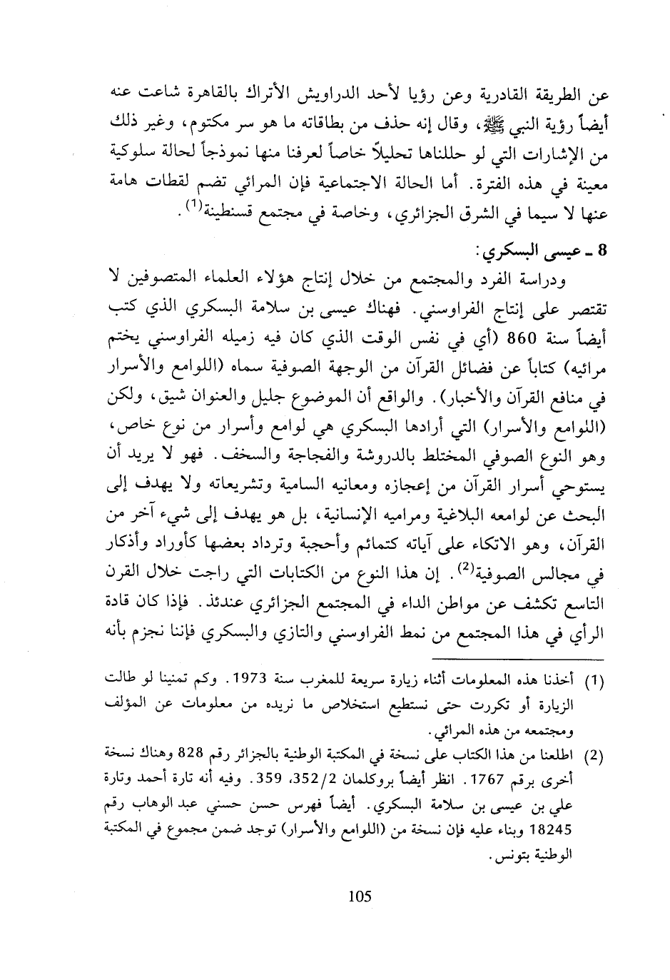 ودواسة الفرد والمجتمع من خلال إنتاج هؤلاء العلماء المتصوفين لا تقتصر على إنتاج الفراوسني. فهناك عيسى بن سلامة البسكري الذي كتب أيضا سنة 860 (أي في نفس الوقت الذي كان فيه زميله الفراوسني يختم مرائيه) كتابا عن فضائل القرآن من الوجهة الصوفية سماه (اللوامع والأسرار في منافع القرآن والأخبار). والواقع أن الموضوع جليل والعنوان شيق، ولكن (اللوامع والأسرار) التي أرادها البسكري هي لوامع وأسرار من نوع خاص، وهو النوع الصوفي المختلط بالدروشة والفجاجة والسخف. فهو لا يريد أن يستوحي أسرار القرآن من إعجازه ومعانيه السامية وتشريعاته ولا يهدف إلى البحث عن لوامعه البلاغية ومراميه الإنسانية، بل هو يهدف إلى شيء آخر من القرآن، وهو الاتكاء على آياته كتمائم وأحجبة وترداد بعضها كأوراد وأذكار في مجالس الصوفية (¬2). إن هذا النوع من الكتابات التي راجت خلال القرن التاسع تكشف عن مواطن الداء في المجتمع الجزائري عندئذ. فإذا كان قادة الرأي في هذا المجتمع من نمط الفراوسني والتازي والبسكري فإننا نجزم بأنه