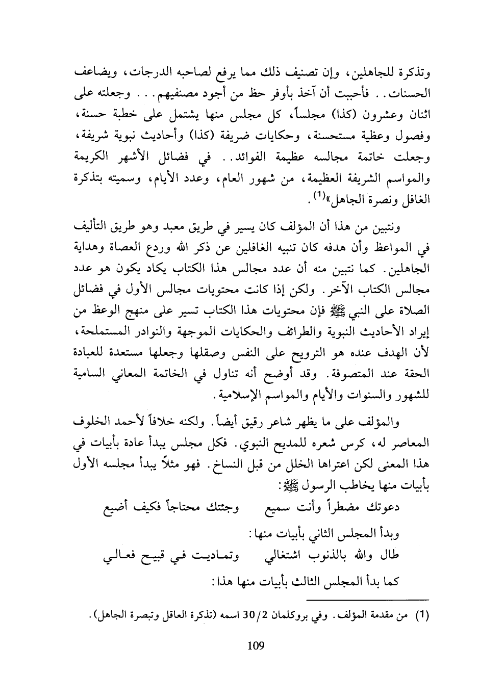 وتذكرة للجاهلين، وإن تصنيف ذلك مما يرفع لصاحبه الدرجات، ويضاعف الحسنات .. فأحببت أن آخذ بأوفر حظ من أجود مصنفيهم ... وجعلته على اثنان وعشرون (كذا) مجلسا، كل مجلس منها يشتمل على خطبة حسنة، وفصول وعظية مستحسنة، وحكايات ضريفة (كذا) وأحاديث نبوية شريفة، وجعلت خاتمة مجالسه عظيمة الفوائد .. في فضائل الأشهر الكريمة والمواسم الشريفة العظيمة، من شهور العام، وعدد الأيام، وسميته بتذكرة الغافل ونصرة الجاهل) (¬1).