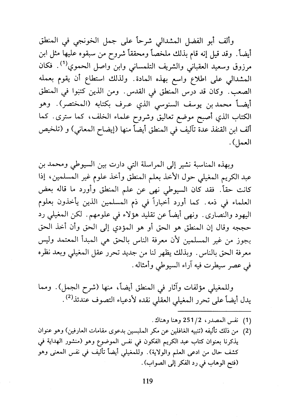 وألف أبو الفضل المشدالي شرحا على جمل الخونجي في المنطق أيضا. وقد قيل إنه قام بذلك ملخصا ومحققا شروح من سبقوه عليها مثل ابن مرزوق وسعيد العقباني والشريف التلمساني وابن واصل الحموي (¬1). فكان المشدالي على اطلاع واسع بهذه المادة. ولذلك استطاع أن يقوم بعمله الصعب. وكان قد درس المنطق في القدس. ومن الذين كتبوا في المنطق أيضا محمد بن يوسف السنوسي الذي عرف بكتابه (المختصر). وهو الكتاب الذي أصبح موضوع تعاليق وشروح علماء الخلف، كما سترى. كما ألف ابن القنفذ عدة تآليف في المنطق أيضا منها (إيضاح المعاني) و (تلخيص العمل).