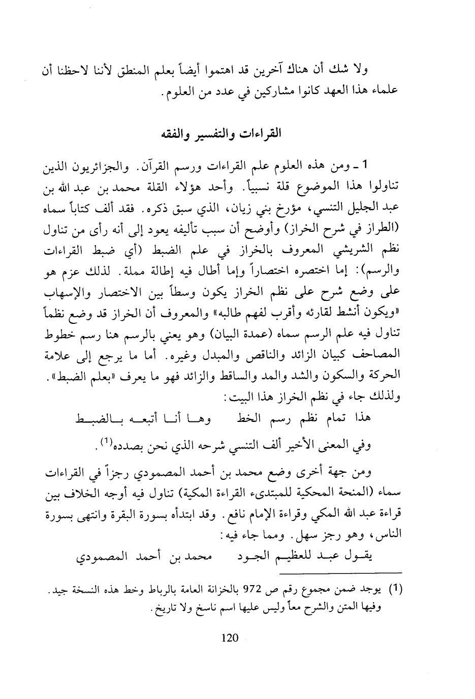 1 - ومن هذه العلوم علم القراءات ورسم القرآن. والجزائريون الذين تناولوا هذا الموضوع قلة نسبيا. وأحد هؤلاء القلة محمد بن عبد الله بن عبد الجليل التنسي، مؤرخ بني زيان، الذي سبق ذكره. فقد ألف كتابا سماه (الطراز في شرح الخراز) وأوضح أن سبب تأليفه يعود إلى أنه رأى من تناول نظم الشريشي المعروف بالخراز في علم الضبط (أي ضبط القراءات والرسم): إما اختصره اختصارا وإما أطال فيه إطالة مملة. لذلك عزم هو على وضع شرح على نظم الخراز يكون وسطا بين الاختصار والإسهاب (ويكون أنشط لقارئه وأقرب لفهم طالبه) والمعروف أن الخراز قد وضع نظما تناول فيه علم الرسم سماه (عمدة البيان) وهو يعني بالرسم هنا رسم خطوط المصاحف كبيان الزائد والناقص والمبدل وغيره. أما ما يرجع إلى علامة الحركة والسكون والشد والمد والساقط والزائد فهو ما يعرف (بعلم الضبط). ولذلك جاء في نظم الخراز هذا البيت: