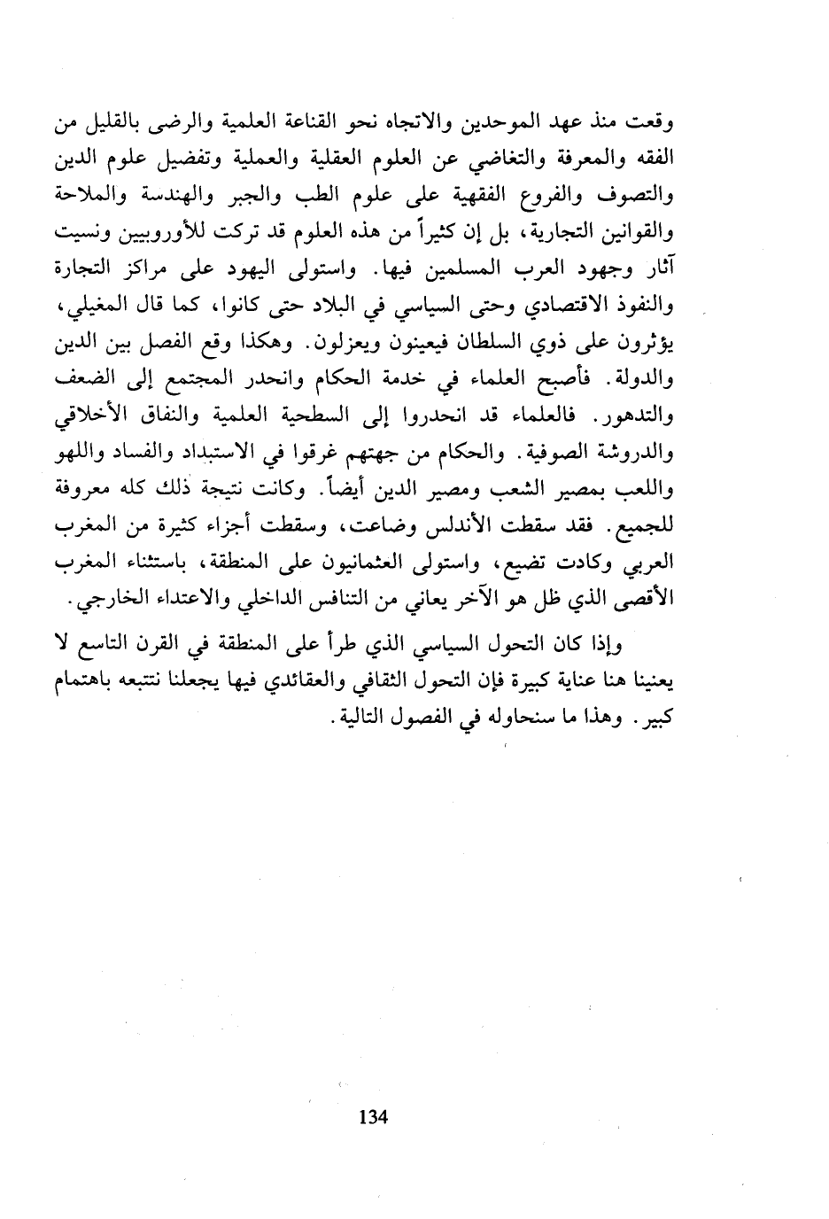 وقعت منذ عهد الموحدين والاتجاه نحو القناعة العلمية والرضى بالقليل من الفقه والمعرفة والتغاضي عن العلوم العقلية والعملية وتفضيل علوم الدين والتصوف والفروع الفقهية على علوم الطب والجبر والهندسة والملاحة والقوانين التجارية، بل إن كثيرا من هذه العلوم قد تركت للأوروبيين ونسيت آثار وجهود العرب المسلمين فيها. واستولى اليهود على مراكز التجارة والنفوذ الاقتصادي وحتى السياسي في البلاد حتى كانوا، كما قال المغيلي، يؤثرون على ذوي السلطان فيعينون ويعزلون. وهكذا وقع الفصل بين الدين والدولة. فأصبح العلماء في خدمة الحكام وانحدر المجتمع إلى الضعف والتدهور. فالعلماء قد انحدروا إلى السطحية العلمية والنفاق الأخلاقي والدروشة الصوفية. والحكام من جهتهم غرقوا في الاستبداد والفساد واللهو واللعب بمصير الشعب ومصير الدين أيضا. وكانت نتيجة ذلك كله معروفة للجميع. فقد سقطت الأندلس وضاعت، وسقطت أجزاء كثيرة من المغرب العربي وكادت تضيع، واستولى العثمانيون على المنطقة، باستثناء المغرب الأقصى الذي ظل هو الآخر يعاني من التنافس الداخلي والاعتداء الخارجي.