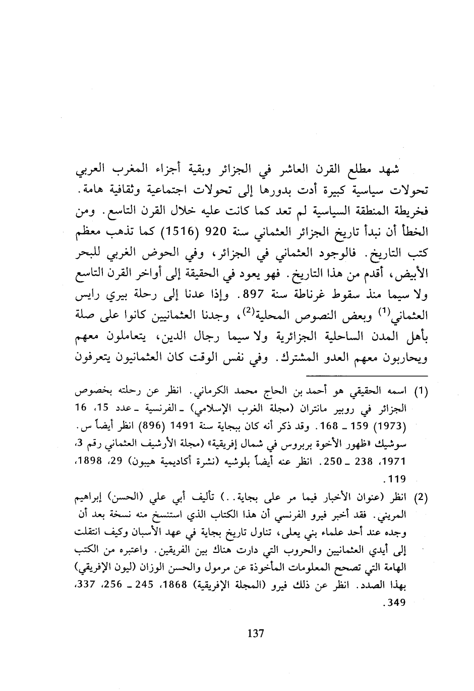شهد مطلع القرن العاشر في الجزائر وبقية أجزاء المغرب العربي تحولات سياسية كبيرة أدت بدورها إلى تحولات اجتماعية وثقافية هامة. فخريطة المنطقة السياسية لم تعد كما كانت عليه خلال القرن التاسع. ومن الخطأ أن نبدأ تاريخ الجزائر العثماني سنة 920 (1516) كما تذهب معظم كتب التاريخ. فالوجود العثماني في الجزائر، وفي الحوض الغربي للبحر الأبيض، أقدم من هذا التاريخ. فهو يعود في الحقيقة إلى أواخر القرن التاسع ولا سيما منذ سقوط غرناطة سنة 897. وإذا عدنا إلى رحلة بيري رايس الثاني (¬1) وبعض النصوص المحلية (¬2)، وجدنا العثمانيين كانوا على صلة بأهل المدن الساحلية الجزائرية ولا سيما رجال الدين، يتعاملون معهم ويحاربون معهم العدو المشترك. وفي نفس الوقت كان العثمانيون يتعرفون