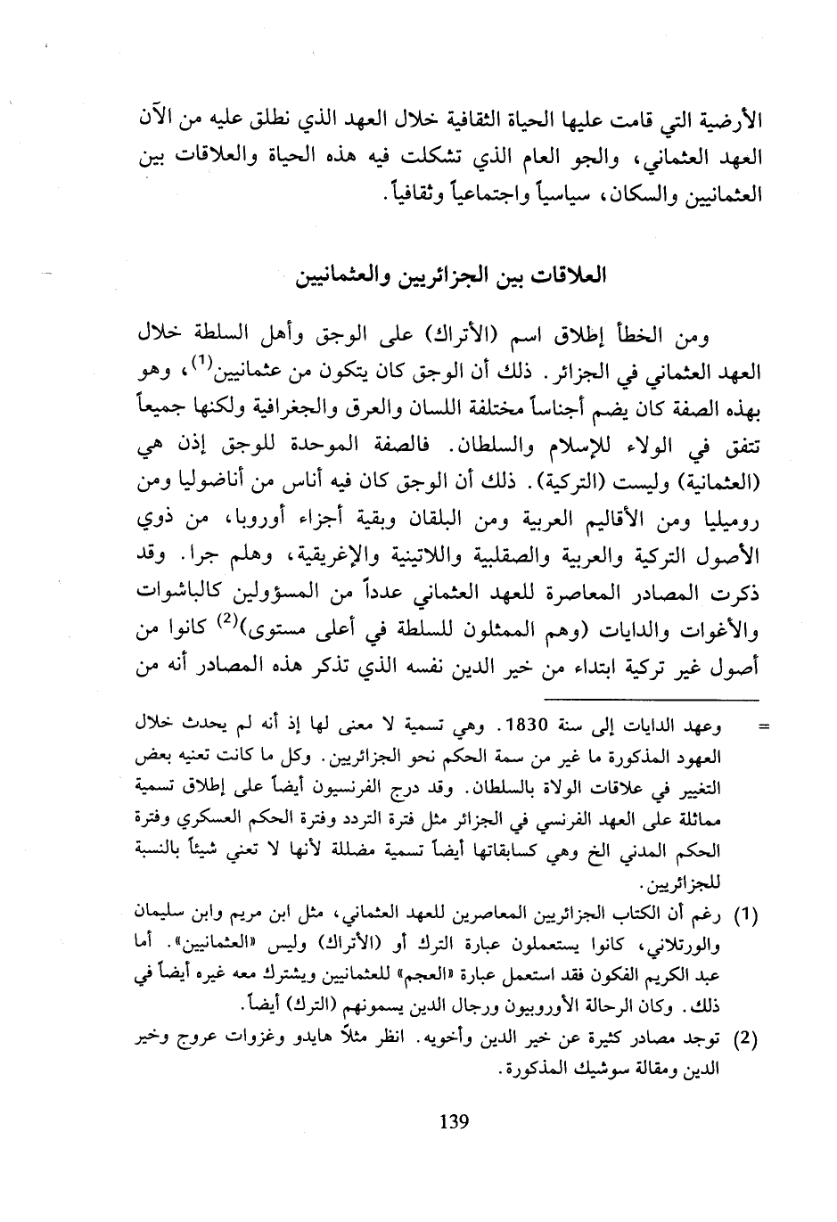 (¬1) رغم أن الكتاب الجزائريين المعاصرين للعهد العثماني، مثل ابن مريم وابن سليمان والورتلاني، كانوا يستعملون عبارة الترك أو (الأتراك) وليس (العثمانيين). أما عبد الكريم الفكون فقد استعمل عبارة (العجم) للعثمانيين ويشترك معه غيره أيضا في ذلك. وكان الرحالة الأوروبيون ورجال الدين يسمونهم (الترك) أيضا.