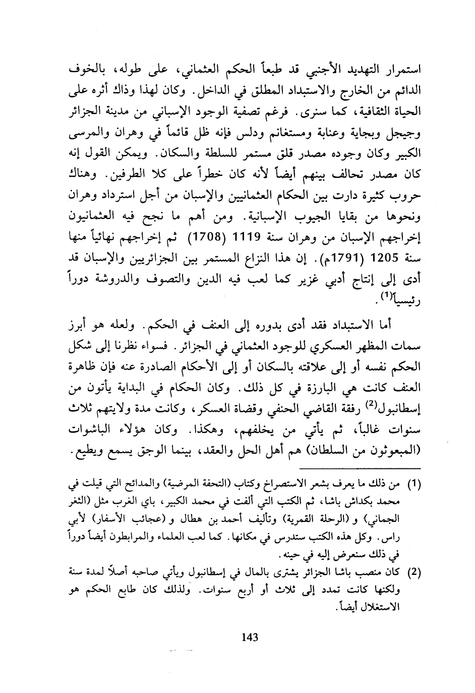(¬1) من ذلك ما يعرف بشعر الاستصراخ وكتاب (التحفة المرضية) والمدائح التي قيلت في محمد بكداش باشا، ثم الكتب التي ألفت في محمد الكبير، باي الغرب مثل (الثغر الجماني) و (الرحلة القمرية) وتأليف أحمد بن هطال و (عجائب الأسفار) لأبي راس. وكل هذه الكتب ستدرس في مكانها. كما لعب العلماء والمرابطون أيضا دورا في ذلك سنعرض إليه في حينه.