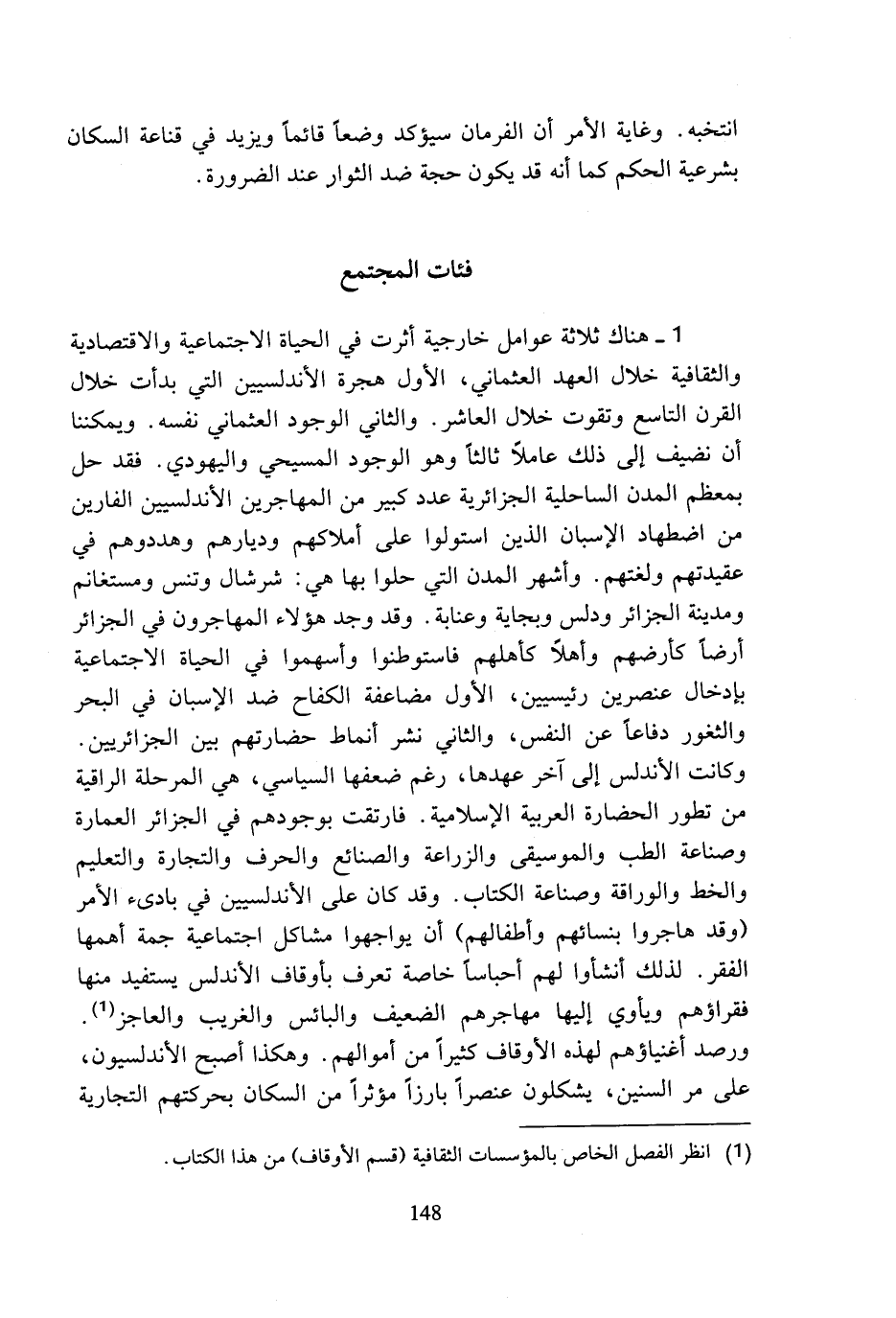 1 - هناك ثلاثة عوامل خارجية أثرت في الحياة الاجتماعية والاقتصادية والثقافية خلال العهد العثماني، الأول هجرة الأندلسيين التي بدأت خلال القرن التاسع وتقوت خلال العاشر. والثاني الوجود العثماني نفسه. ويمكننا أن نضيف إلى ذلك عاملا ثالثا وهو الوجود المسيحي واليهودي. فقد حل بمعظم المدن الساحلية الجزائرية عدد كبير من المهاجرين الأندلسيين الفارين من اضطهاد الإسبان الذين استولوا على أملاكهم وديارهم وهددوهم في عقيدتهم ولغتهم. وأشهر المدن التي حلوا بها هي: شرشال وتنس ومستغانم ومدينة الجزائر ودلس وبجاية وعنابة. وقد وجد هؤلاء المهاجرون في الجزائر أرضا كأرضهم وأهلا كأهلهم فاستوطنوا وأسهموا في الحياة الاجتماعية بإدخال عنصرين رئيسيين، الأول مضاعفة الكفاح ضد الإسبان في البحر والثغور دفاعا عن النفس، والثاني نشر أنماط حضارتهم بين الجزائريين. وكانت الأندلس إلى آخر عهدها، رغم ضعفها السياسي، هي المرحلة الراقية من تطور الحضارة العربية الإسلامية. فارتقت بوجودهم في الجزائر العمارة وصناعة الطب والموسيقى والزراعة والصنائع والحرف والتجارة والتعليم والخط والوراقة وصناعة الكتاب. وقد كان على الأندلسيين في بادئ الأمر (وقد هاجروا بنسائهم وأطفالهم) أن يواجهوا مشاكل اجتماعية جمة أهمها الفقر. لذلك أنشأوا لهم أحباسا خاصة تعرف بأوقاف الأندلس يستفيد منها فقراؤهم ويأوي إليها مهاجرهم الضعيف والبائس والغريب والعاجز (¬1). ورصد أغنياؤهم لهذه الأوقاف كثيرا من أموالهم. وهكذا أصبح الأندلسيون، على مر السنين، يشكلون عنصرا بارزا مؤثرا من السكان بحركتهم التجارية