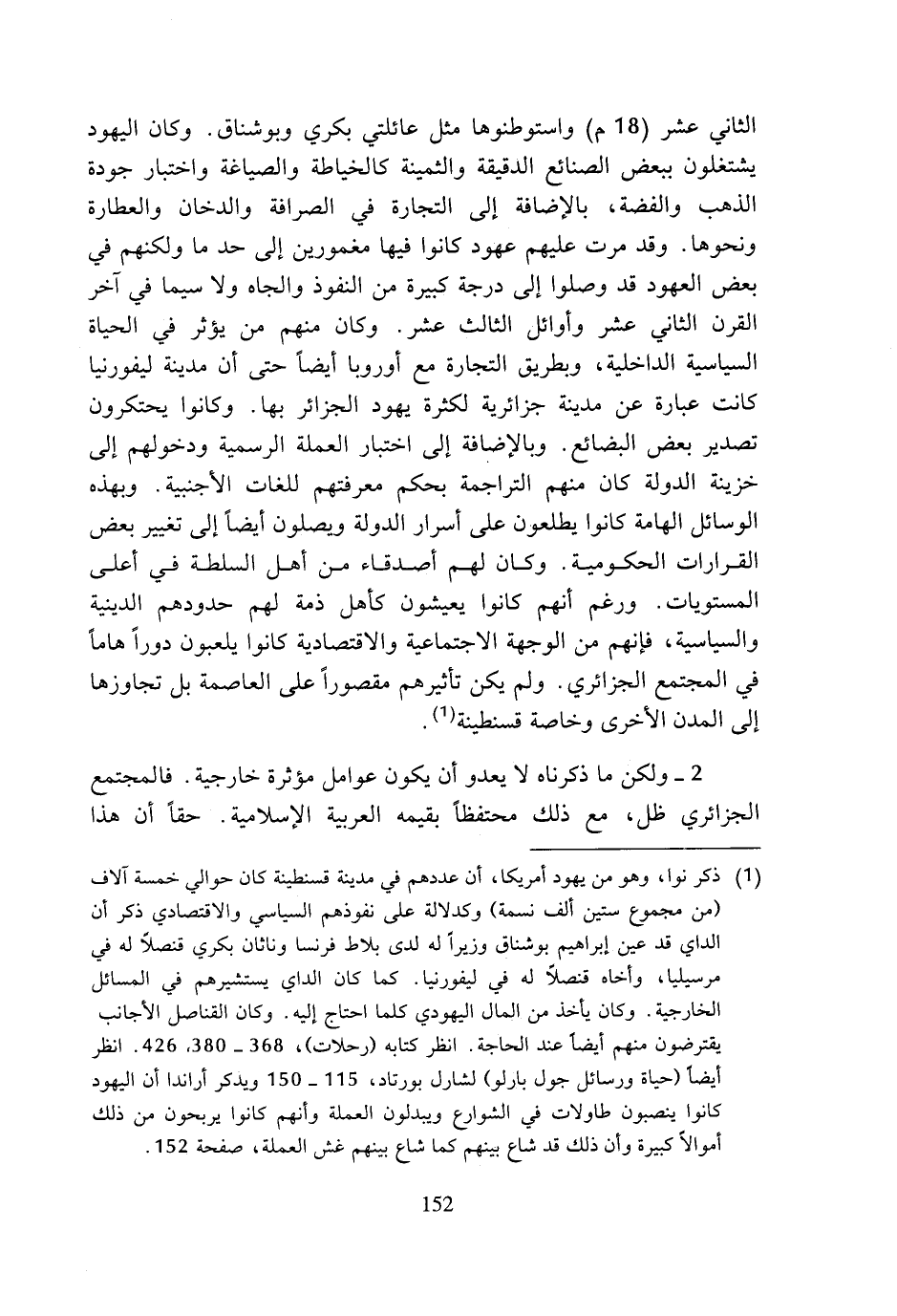 الثاني عشر (18 م) واستوطنوها مثل عائلتي بكري وبوشناق. وكان اليهود يشتغلون ببعض الصنائع الدقيقة والثمينة كالخياطة والصياغة واختبار جودة الذهب والفضة، بالإضافة إلى التجارة في الصرافة والدخان والعطارة ونحوها. وقد مرت عليهم عهود كانوا فيها مغمورين إلى حد ما ولكنهم في بعض العهود قد وصلوا إلى درجة كبيرة من النفوذ والجاه ولا سيما في آخر القرن الثاني عشر وأوائل الثالث عشر. وكان منهم من يؤثر في الحياة السياسية الداخلية، وبطريق التجارة مع أوروبا أيضا حتى أن مدينة ليفورنيا كانت عبارة عن مدينة جزائرية لكثرة يهود الجزائر بها. وكانوا يحتكرون تصدير بعض البضائع. وبالإضافة إلى اختبار العملة الرسمية ودخولهم إلى خزينة الدولة كان منهم التراجمة بحكم معرفتهم للغات الأجنبية. وبهذه الوسائل الهامة كانوا يطلعون على أسرار الدولة ويصلون أيضا إلى تغيير بعض القرارات الحكومية. وكان لهم أصدقاء من أهل السلطة في أعلى المستويات. ورغم أنهم كانوا يعيشون كأهل ذمة لهم حدودهم الدينية والسياسية، فإنهم من الوجهة الاجتماعية والاقتصادية كانوا يلعبون دورا هاما في المجتمع الجزائري. ولم يكن تأثيرهم مقصورا على العاصمة بل تجاوزها إلى المدن الأخرى وخاصة قسنطينة (¬1).