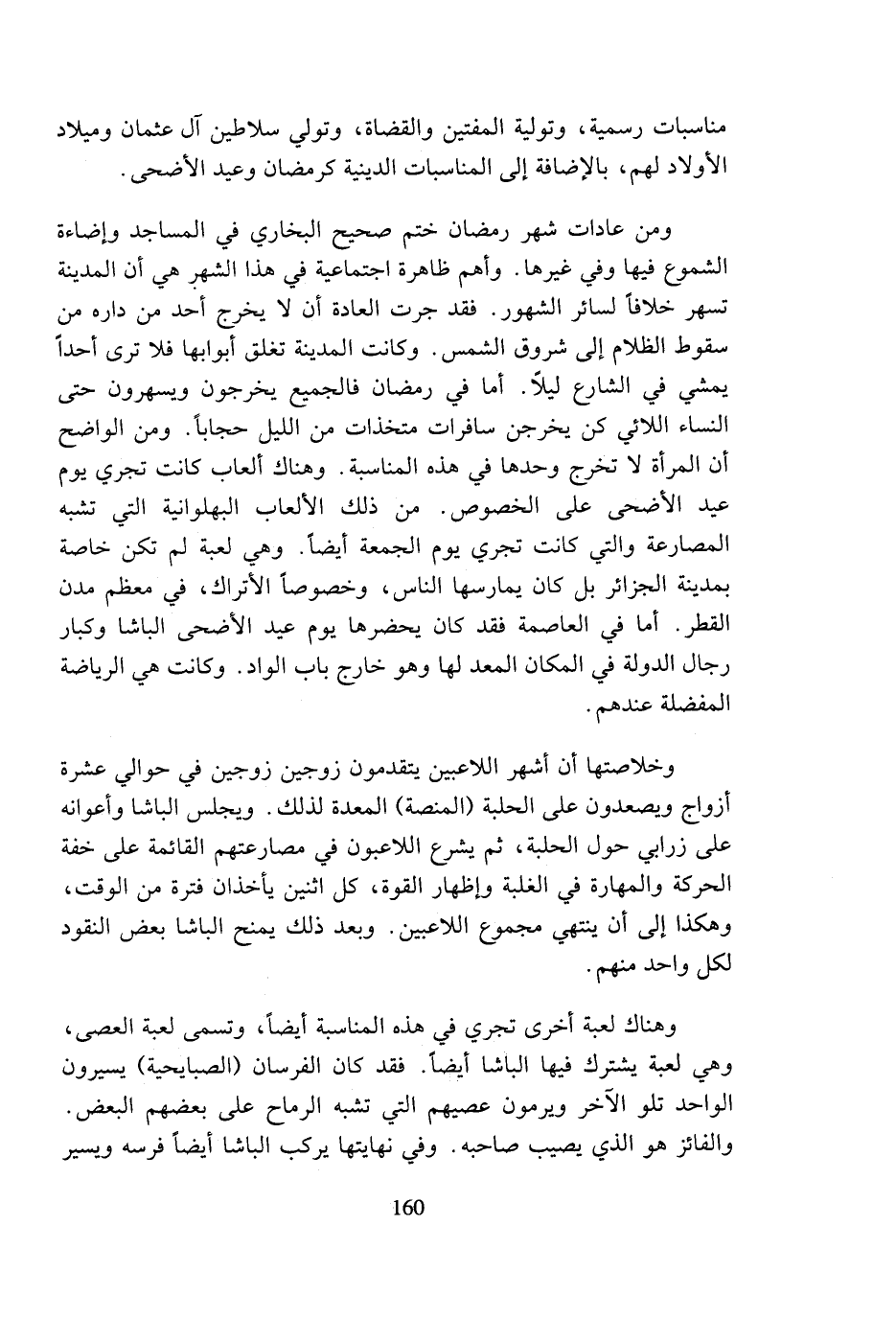 ومن عادات شهر رمضان ختم صحيح البخاري في المساجد وإضاءة الشموع فيها وفي غيرها. وأهم ظاهرة اجتماعية في هذا الشهر هي أن المدينة تسهر خلافا لسائر الشهور. فقد جرت العادة أن لا يخرج أحد من داره من سقوط الظلام إلى شروق الشمس. وكانت المدينة تغلق أبوابها فلا ترى أحدا يمشي في الشارع ليلا. أما في رمضان فالجميع يخرجون ويسهرون حتى النساء اللائي كن يخرجن سافرات متخذات من الليل حجابا. ومن الواضح أن المرأة لا تخرج وحدها في هذه المناسبة. وهناك ألعاب كانت تجري يوم عيد الأضحى على الخصوص. من ذلك الألعاب البهلوانية التي تشبه المصارعة والتي كانت تجري يوم الجمعة أيضا. وهي لعبة لم تكن خاصة بمدينة الجزائر بل كان يمارسها الناس، وخصوصا الأتراك، في معظم مدن القطر. أما في العاصمة فقد كان يحضرها يوم عيد الأضحى الباشا وكبار رجال الدولة في المكان المعد لها وهو خارج باب الواد. وكانت هي الرياضة المفضلة عندهم.