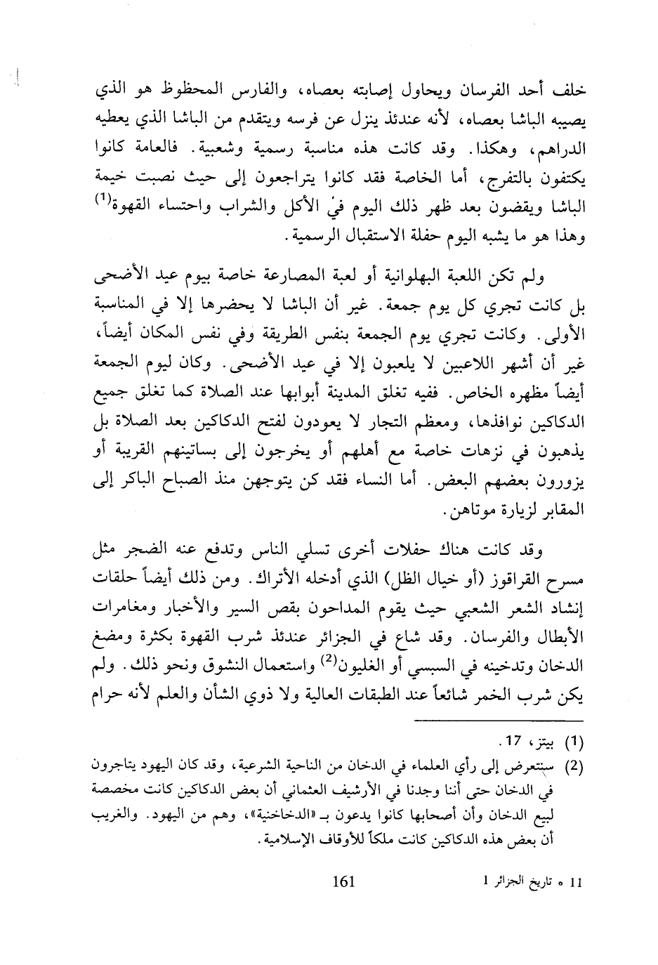 وقد كانت هناك حفلات أخرى تسلي الناس وتدفع عنهم الضجر مثل مسرح القراقوز (أو خيال الظل) الذي أدخله الأتراك. ومن ذلك أيضا حلقات إنشاد الشعر الشعبي حيت يقوم المداحون بقص السير والأخبار ومغامرات الأبطال والفرسان. وقد شاع في الجزائر عندئذ شرب القهوة بكثرة ومضغ الدخان وتدخينه في السبسي أو الغليون (¬2) واستعمال النشوق ونحو ذلك. ولم يكن شرب الخمر شائعا عند الطبقات العالية ولا ذوي الشأن والعلم لأنه حرام
