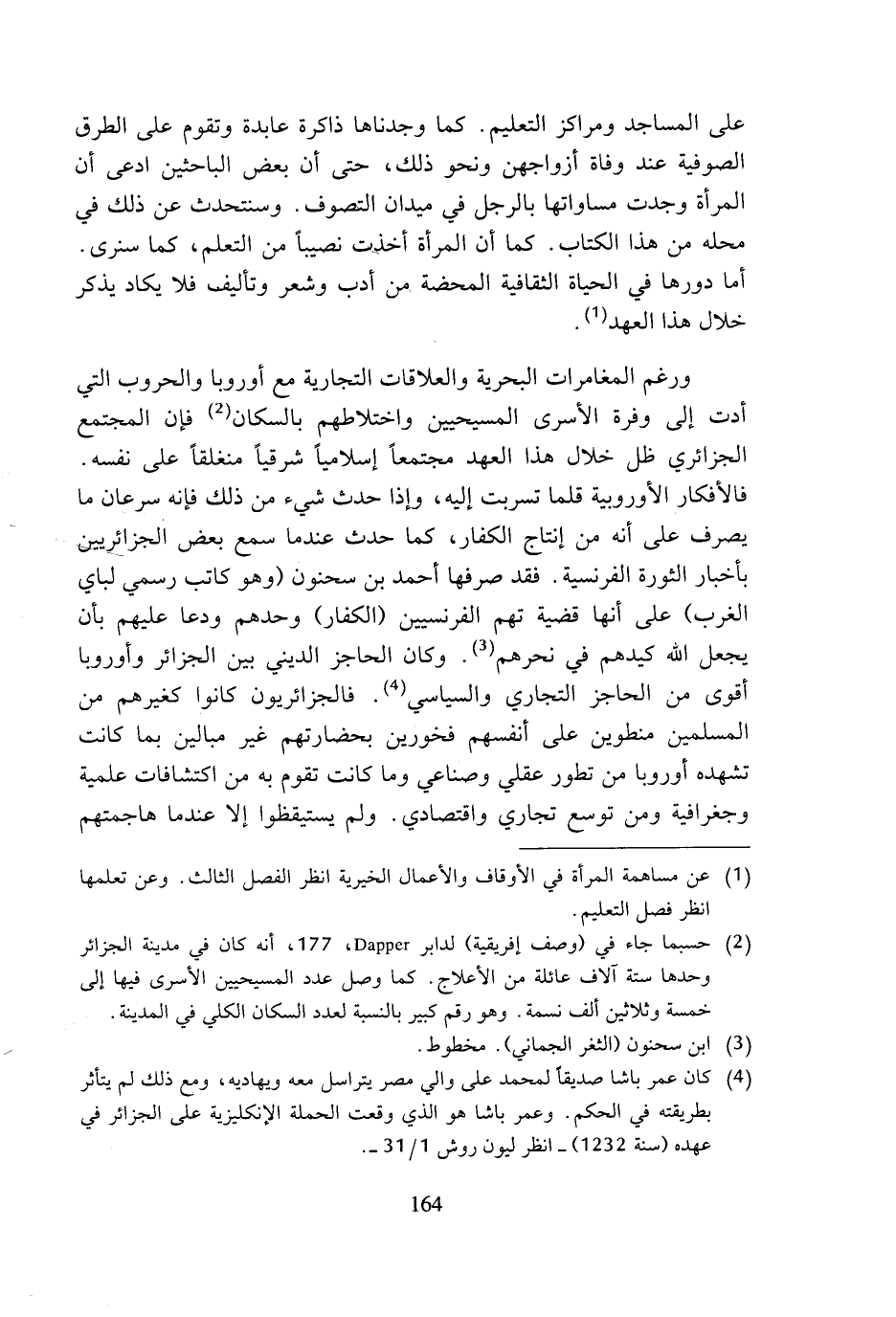 ورغم المغامرات البحرية والعلاقات التجارية مع أوروبا والحروب التي أدت إلى وفرة الأسرى المسيحيين واختلاطهم بالسكان (¬2) فإن المجتمع الجزائري ظل خلال هذا العهد مجتمعا إسلاميا شرقيا منغلقا على نفسه. فالأفكار الأوروبية قلما تسربت إليه، وإذا حدث شيء من ذلك فإنه سرعان ما يصرف على أنه من إنتاج الكفار، كما حدث عندما سمع بعض الجزائريين بأخبار الثورة الفرنسية. فقد صرفها أحمد بن سحنون (وهو كاتب رسمي لباي الغرب) على أنها قضية تهم الفرنسيين (الكفار) وحدهم ودعا عليهم بأن يجعل الله كيدهم في نحرهم (¬3). وكان الحاجز الديني بين الجزائر وأوروبا أقوى من الحاجز التجاري والسياسي (¬4). فالجزائريون كانوا كغيرهم من المسلمين منطوين على أنفسهم فخورين بحضارتهم غير مبالين بما كانت تشهده أوروبا من تطور عقلي وصناعي وما كانت تقوم به من اكتشافات علمية وجغرافية ومن توسع تجاري واقتصادي. ولم يستيقظوا إلا عندما هاجمتهم