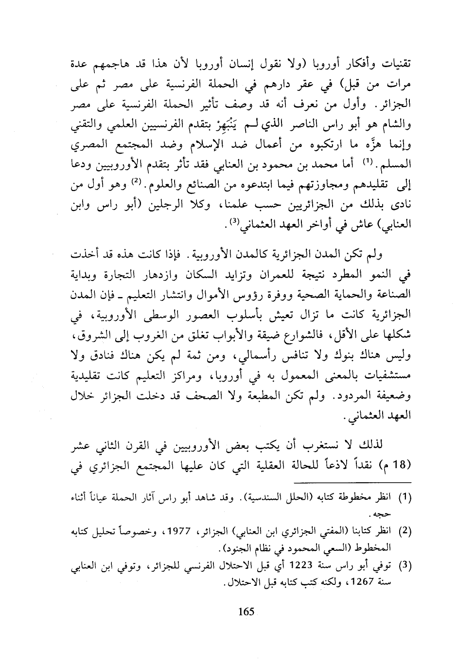 تقنيات وأفكار أوروبا (ولا نقول إنسان أوروبا لأن هذا قد هاجمهم عدة مرات من قبل) في عقر دارهم في الحملة الفرنسية على مصر ثم على الجزائر. وأول من نعرف أنه قد وصف تأثير الحملة الفرنسية على مصر والشام هو أبو راس الناصر الذي لم ينبهر بتقدم الفرنسيين العلمي والتقني وإنما هزه ما ارتكبوه من أعمال ضد الإسلام وضد المجتمع المصري المسلم. (¬1) أما محمد بن محمود بن العنابي فقد تأثر بتقدم الأوروبيين ودعا إلى تقليدهم ومجاوزتهم فيما ابتدعوه من الصنائع والعلوم. (¬2) وهو أول من نادى بذلك من الجزائريين حسب علمنا، وكلا الرجلين (أبو راس وابن العنابي) عاش في أواخر العهد العثماني (¬3).
