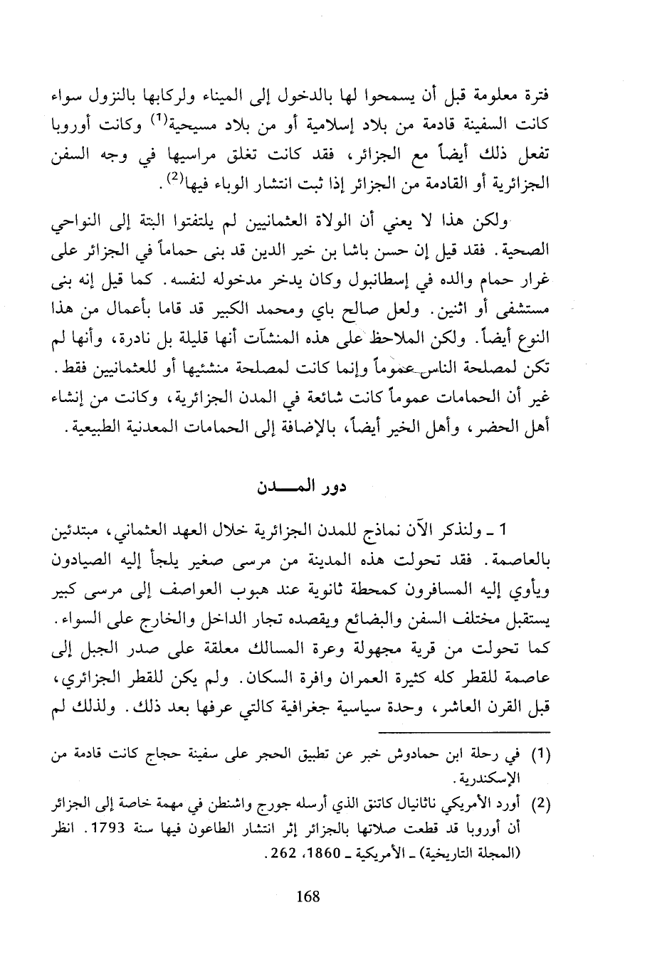 1 - ولنذكر الآن نماذج للمدن الجزائرية خلال العهد العثماني، مبتدئين بالعاصمة. فقد تحولت هذه المدينة من مرسى صغير يلجأ إليه الصيادون ويأوي إليه المسافرون كمحطة ثانوية عند هبوب العواصف إلى مرسى كبير يستقبل مختلف السفن والبضائع ويقصده تجار الداخل والخارج على السواء. كما تحولت من قرية مجهولة وعرة المسالك معلقة على صدر الجبل إلى عاصمة للقطر كله كثيرة العمران وافرة السكان. ولم يكن للقطر الجزائري، قبل القرن العاشر، وحدة سياسية جغرافية كالتي عرفها بعد ذلك. ولذلك لم