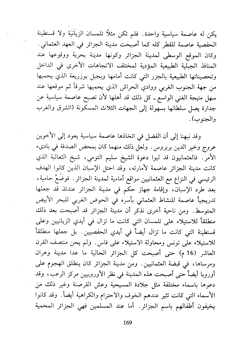 يكن له عاصمة سياسية واحدة. فلم تكن مثلا تلمسان الزيانية ولا قسنطينة الحفصية عاصمة للقطر كله كما أصبحت مدينة الجزائر في العهد العثماني. وكان الموقع الوسطي لمدينة الجزائر وكونها مدينة بحرية ووقوعها عند المنافذ الجبلية الطبيعية المؤدية لمختلف الاتجاهات الأخرى في الداخل وتحصيناتها الطبيعية بالجزر التي كانت أمامها وبجبل بوزريعة الذي يحميها من جهة الجنوب الغربي ووادي الحراش الذي يحميها شرقا ثم موقعها عند سهل متيجة الغني الواسع - كل ذلك قد أهلها لأن تصبح عاصمة سياسية عن جدارة يصل سلطانها بسهولة إلى الجهات الثلاث المسكونة (الشرق والغرب والجنوب).