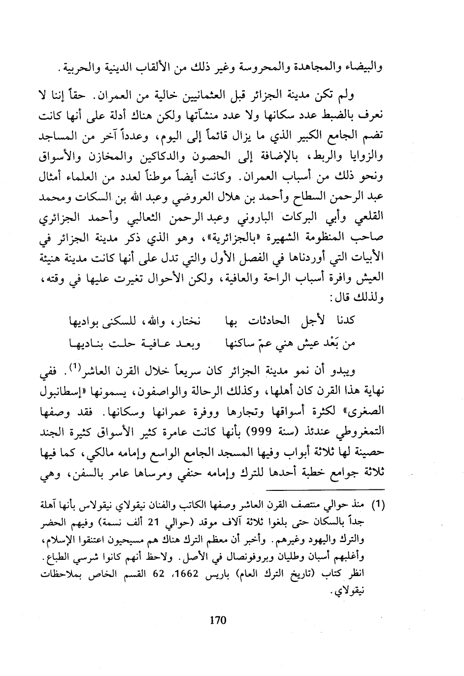 ولم تكن مدينة الجزائر قبل العثمانيين خالية من العمران. حقا إننا لا نعرف بالضبط عدد مكانها ولا عدد منشآتها ولكن هناك أدلة على أنها كانت تضم الجامع الكبير الذي ما يزال قائما إلى اليوم، وعددا آخر من المساجد والزوايا والربط، بالإضافة إلى الحصون والدكاكين والمخازن والأسواق ونحو ذلك من أسباب العمران. وكانت أيضا موطنا لعدد من العلماء أمثال عبد الرحمن السطاح وأحمد بن هلال العروضي وعبد الله بن السكات ومحمد القلعي وأبي البركات الباروني وعبد الرحمن الثعالبي وأحمد الجزائري صاحب المنظومة الشهيرة (بالجزائرية)، وهو الذي ذكر مدينة الجزائر في الأبيات التي أوردناها في الفصل الأول والتي تدل على أنها كانت مدينة هنيئة العيش وافرة أسباب الراحة والعافية، ولكن الأحوال تغيرت عليها في وقته، ولذلك قال: