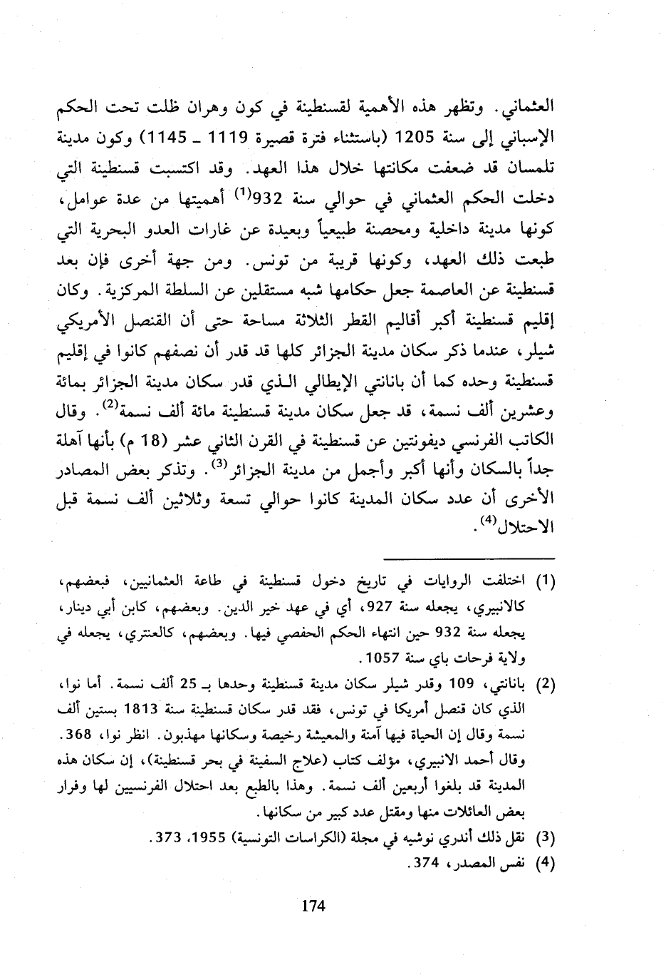 (¬2) بانانتي، 109 وقدر شيلر سكان مدينة قسنطينة وحدها بـ 25 ألف نسمة. أما نوا، الذي كان قنصل أمريكا في تونس، فقد قدر سكان قسنطينة سنة 1813 بستين ألف نسمة وقال إن الحياة فيها آمنة والمعيشة رخيصة وسكانها مهذبون. انظر نوا، 368. وقال أحمد الانبيري، مؤلف كتاب (علاج السفينة في بحر قسنطينة)، إن سكان هذه المدينة قد بلغوا أربعين ألف نسمة. وهذا بالطبع بعد احتلال الفرنسيين لها وفرار بعض العائلات منها ومقتل عدد كبير من سكانها.