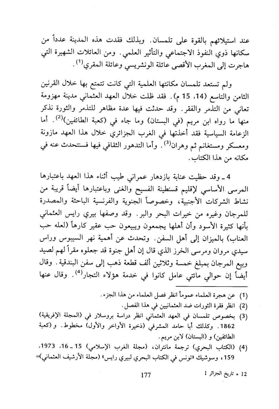(¬3) بخصوص تلمسان في العهد العثماني انظر دراسة بروسلار في (المجلة الإفريقية) 1862. وكذلك أبا حامد المشرفي (ذخيرة الأواخر والأول) مخطوط. و (كعبة الطائفين) و (البستان) لابن مريم.