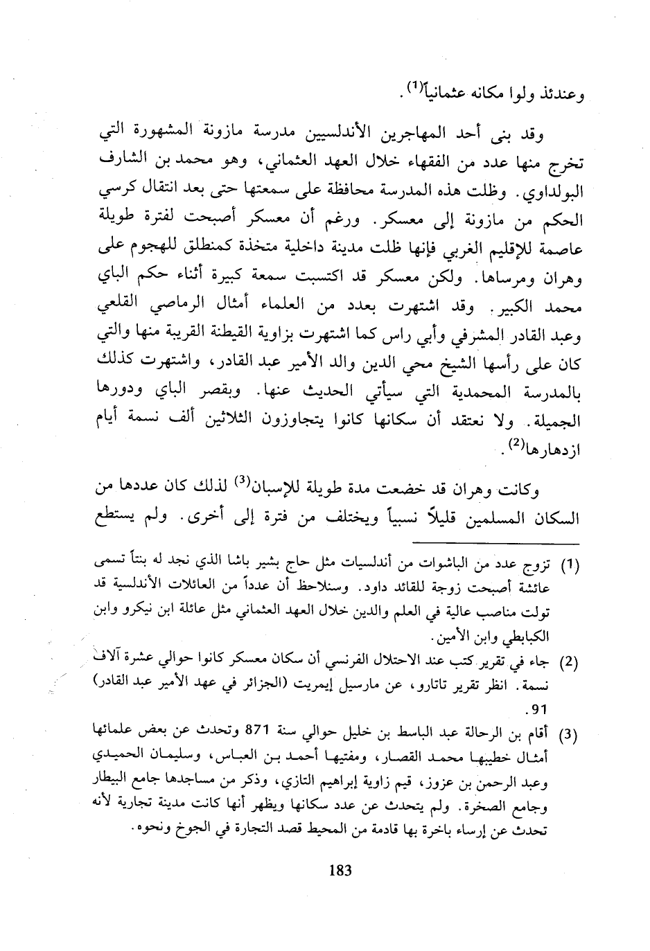 وكانت وهران قد خضعت مدة طويلة للإسبان (¬3) لذلك كان عددها من السكان المسلمين قليلا نسبيا ويختلف من فترة إلى أخرى. ولم يستطع