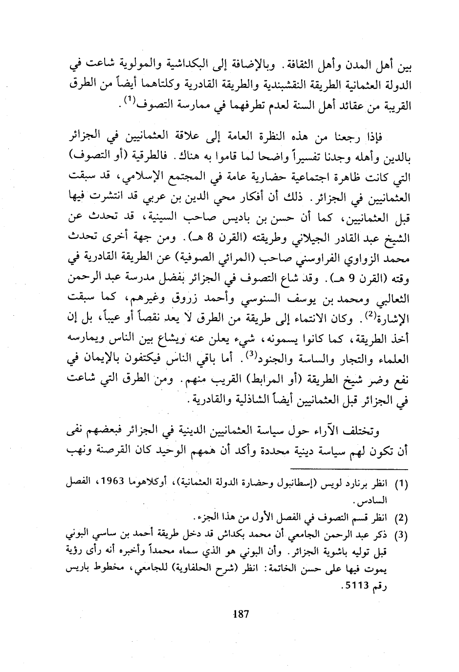 فإذا رجعنا من هذه النظرة العامة إلى علاقة العثمانيين في الجزائر بالدين وأهله وجدنا تفسيرا واضحا لما قاموا به هناك. فالطرقية (أو التصوف) التي كانت ظاهرة اجتماعية حضارية عامة في المجتمع الإسلامي، قد سبقت العثمانيين في الجزائر. ذلك أن أفكار محيي الدين بن عربي قد انتشرت فيها قبل العثمانيين، كما أن حسن بن باديس صاحب السينية، قد تحدث عن الشيخ عبد القادر الجيلاني وطريقته (القرن 8 هـ). ومن جهة أخرى تحدث محمد الزواوي الفراوسني صاحب (المرائي الصوفية) عن الطريقة القادرية في وقته (القرن 9 هـ). وقد شاع التصوف في الجزائر بفضل مدرسة عبد الرحمن الثعالبي ومحمد بن يوسف السنوسي وأحمد زروق وغيرهم، كما سبقت الإشارة (¬2). وكان الانتماء إلى طريقة من الطرق لا يعد نقصا أو عيبا، بل إن أخذ الطريقة، كما كانوا يسمونه، شيء يعلن عنه ويشاع بين الناس ويمارسه العلماء والتجار والساسة والجنود (¬3). أما باقي الناس فيكتفون بالإيمان في نفع وضر شيخ الطريقة (أو المرابط) القريب منهم. ومن الطرق التي شاعت في الجزائر قبل العثمانيين أيضا الشاذلية والقادرية.