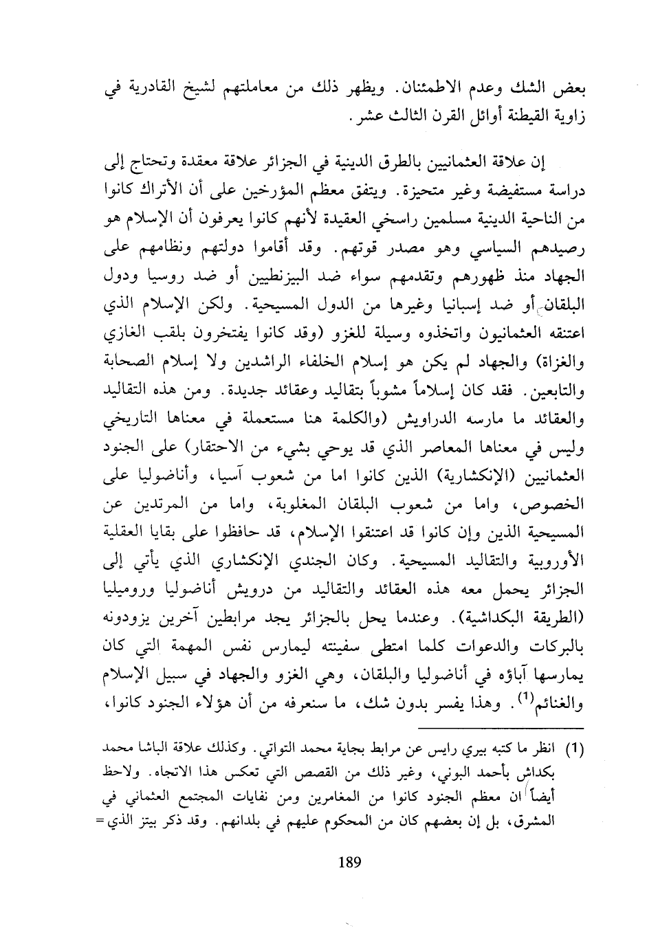 إن علاقة العثمانيين بالطرق الدينية في الجزائر علاقة معقدة وتحتاج إلى دراسة مستفيضة وغير متحيزة. ويتفق معظم المؤرخين على أن الأتراك كانوا من الناحية الدينية مسلمين راسخي العقيدة لأنهم كانوا يعرفون أن الإسلام هو رصيدهم السياسي وهو مصدر قوتهم. وقد أقاموا دولتهم ونظامهم على الجهاد منذ ظهورهم وتقدمهم سواء ضد البيزنطيين أو ضد روسيا ودول البلقان أو ضد إسبانيا وغيرها من الدول المسيحية. ولكن الإسلام الذي اعتنقه العثمانيون واتخذوه وسيلة للغزو (وقد كانوا يفتخرون بلقب الغازي والغزاة) والجهاد لم يكن هو إسلام الخلفاء الراشدين ولا إسلام الصحابة والتابعين. فقد كان إسلاما مشوبا بتقاليد وعقائد جديدة. ومن هذه التقاليد والعقائد ما مارسه الدراويش (والكلمة هنا متعملة في معناها التاريخي وليس في معناها المعاصر الذي قد يوحي بشيء من الاحتقار) على الجنود العثمانيين (الإنكشارية) الذين كانوا إما من شعوب آسيا، وأناضوليا على الخصوص، وإما من شعوب البلقان المغلوبة، وإما من المرتدين عن المسيحية الذين وإن كانوا قد اعتنقوا الإسلام، قد حافظوا على بقايا العقلية الأوروبية والتقاليد المسيحية. وكان الجندي الإنكشاري الذي يأتي إلى الجزائر يحمل معه هذه العقائد والتقاليد من درويش أناضوليا وروميليا (الطريقة البكداشية). وعندما يحل بالجزائر يجد مرابطين آخرين يزودونه بالبركات والدعوات كلما امتطى سفينته ليمارس نفس المهمة التي كان يمارسها آباؤه في أناضوليا والبلقان، وهي الغزو والجهاد في سبيل الإسلام والغنائم (¬1). وهذا يفسر بدون شك، ما سنعرفه من أن هؤلاء الجنود كانوا،