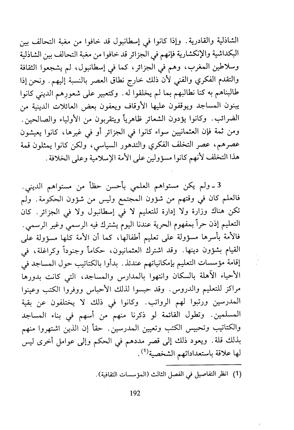 الشاذلية والقادرية. وإذا كانوا في إسطانبول قد خافوا من مغبة التحالف بين البكداشية والإنكشارية فإنهم في الجزائر قد خافوا من مغبة التحالف بين الشاذلية وسلاطين المغرب، وهم في الجزائر، كما في إسطانبول، لم يشجعوا الثقافة والتقدم الفكري والفني لأن ذلك خارج نطاق العصر بالنسبة إليهم. ونحن إذا طالبناهم به كنا نطالبهم بما لم يخلقوا له. وكتعبير على شعورهم الديني كانوا يبنون المساجد ويوقفون عليها الأوقاف ويعفون بعض العائلات الدينية من الضرائب. وكانوا يؤدون الشعائر ظاهريا ويتقربون من الأولياء والصالحين. ومن ثمة فإن العثمانيين سواء كانوا في الجزائر أو في غيرها، كانوا يعيشون عصرهم، عصر التخلف الفكري والتدهور السياسي، ولكن كانوا يمثلون قمة هذا التخلف لأنهم كانوا مسؤولين على الأمة الإسلامية وعلى الخلافة.