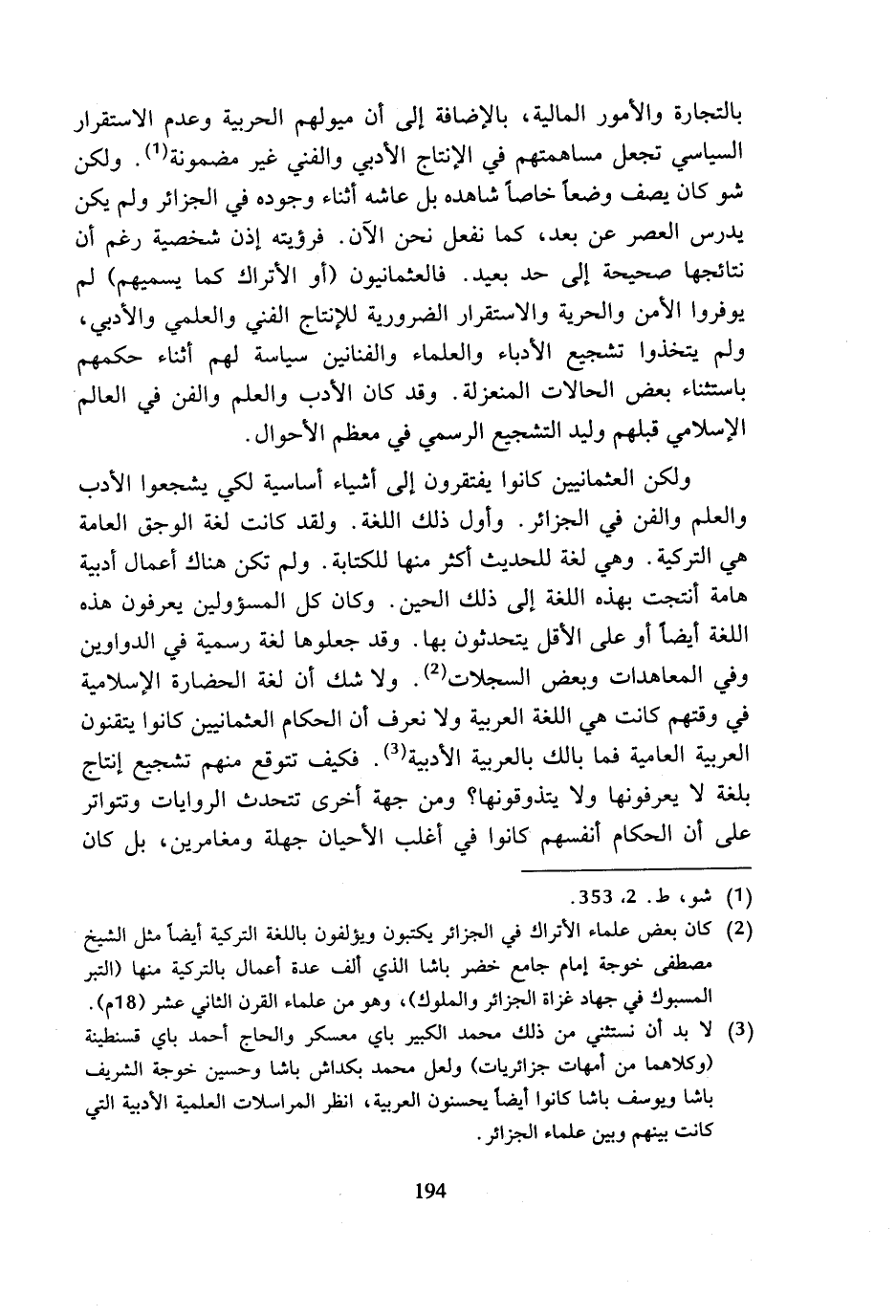 (¬3) لا بد أن نستثني من ذلك محمد الكبير باي معسكر والحاج أحمد باي قسنطينة (وكلاهما من أمهات جزائريات) ولعل محمد بكداش باشا وحسين خوجة الشريف باشا ويوسف باشا كانوا أيضا يحسنون العربية، انظر المراسلات العلمية الأدبية التي كانت بينهم وبين علماء الجزائر.