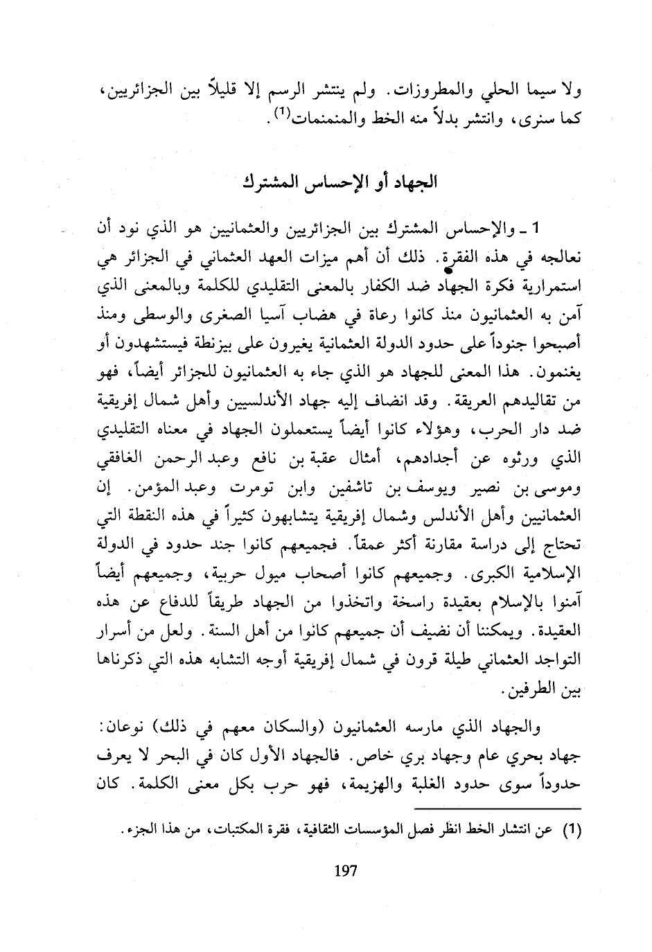 1 - والإحساس المشترك بين الجزائريين والعثمانيين هو الذي نود أن نعالجه في هذه الفقرة. ذلك أن أهم ميزات العهد العثماني في الجزائر هي استمرارية فكرة الجهاد ضد الكفار بالمعنى التقليدي للكلمة وبالمعنى الذي آمن به العثمانيون منذ كانوا رعاة في هضاب آسيا الصغرى والوسطى ومنذ أصبحوا جنودا على حدود الدولة العثمانية يغيرون على بيزنطة فيستشهدون أو يغنمون. هذا المعنى للجهاد هو الذي جاء به العثمانيون للجزائر أيضا، فهو من تقاليدهم العريقة. وقد انضاف إليه جهاد الأندلسيين وأهل شمال إفريقية ضد دار الحرب، وهؤلاء كانوا أيضا يستعملون الجهاد في معناه التقليدي الذي ورثوه عن أجدادهم، أمثال عقبة بن نافع وعبد الرحمن الغافقي وموسى بن نصير ويوسف بن تاشفين وابن تومرت وعبد المؤمن. إن العثمانيين وأهل الأندلس وشمال إفريقية يتشابهون كثيرا في هذه النقطة التي تحتاج إلى دراسة مقارنة أكثر عمقا. فجميعهم كانوا جند حدود في الدولة الإسلامية الكبرى. وجميعهم كانوا أصحاب ميول حربية، وجميعهم أيضا آمنوا بالإسلام بعقيدة راسخة واتخذوا من الجهاد طريقا للدفاع عن هذه العقيدة. ويمكننا أن نضيف أن جميعهم كانوا من أهل السنة. ولعل من أسرار التواجد العثماني طيلة قرون في شمال إفريقية أوجه التشابه هذه التي ذكرناها بين الطرفين.