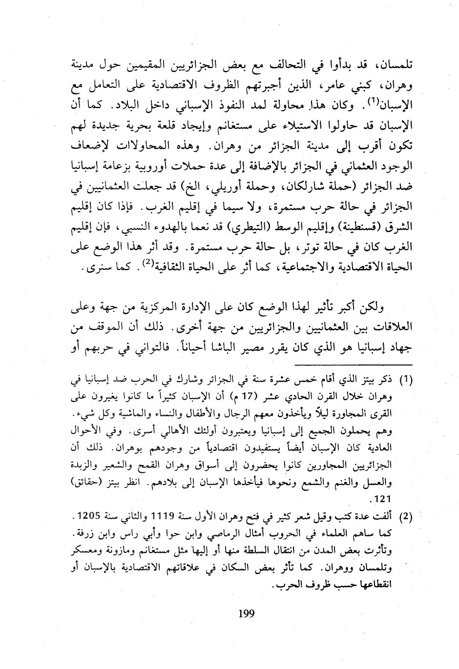 (¬1) ذكر بيتز الذي أقام خمس عشرة سنة في الجزائر وشارك في الحرب ضد إسبانيا في وهران خلال القرن الحادي عشر (17 م) أن الإسبان كثيرا ما كانوا يغيرون على القرى المجاورة ليلا ويأخذون معهم الرجال والأطفال والنساء والماشية وكل شيء. وهم يحملون الجميع إلى إسبانيا ويعتبرون أولئك الأهالي أسرى. وفي الأحوال العادية كان الإسبان أيضا يستفيدون اقتصاديا من وجودهم بوهران. ذلك أن الجزائريين المجاورين كانوا يحضرون إلى أسواق وهران القمح والشعير والزبدة والعسل والغنم والشمع ونحوها فيأخذها الإسبان إلى بلادهم. انظر بيتز (حقائق) 121.
