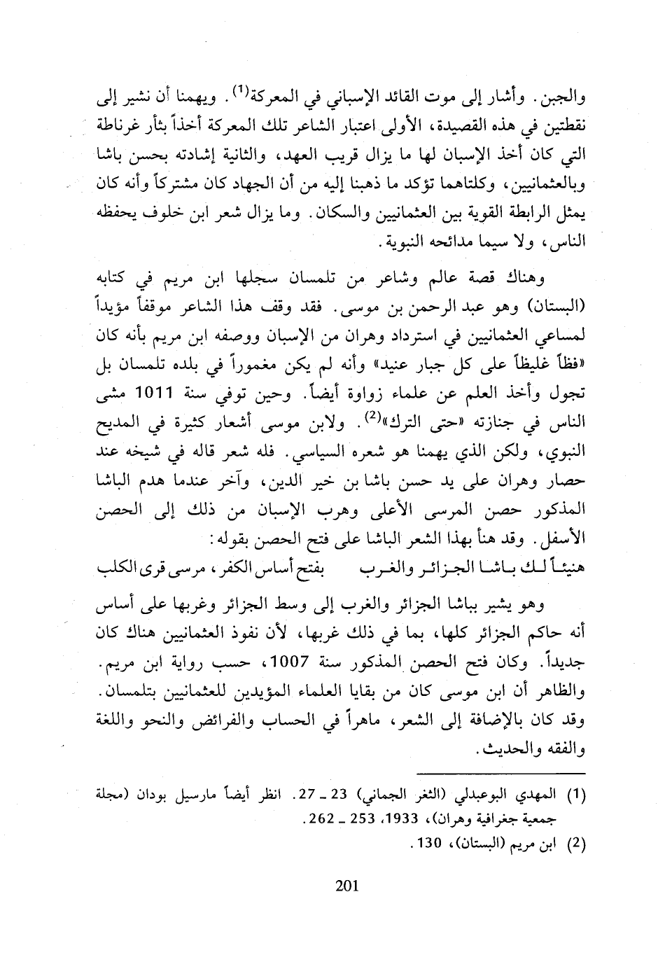 وهناك قصة عالم وشاعر من تلمسان سجلها ابن مريم في كتابه (البستان) وهو عبد الرحمن بن موسى. فقد وقف هذا الشاعر موقفا مؤيدا لمساعي العثمانيين في استرداد وهران من الإسبان ووصفه ابن مريم بأنه كان (فظا غليظا على كل جبار عنيد) وأنه لم يكن مغمورا في بلده تلمسان بل تجول وأخذ العلم عن علماء زواوة أيضا. وحين توفي سنة 1011 مشى الناس في جنازته (حنى الترك) (¬2). ولابن موسى أشعار كثيرة في المديح النبوي، ولكن الذي يهمنا هو شعره السياسي. فله شعر قاله في شيخه عند حصار وهران على يد حسن باشا بن خير الدين، وآخر عندما هدم الباشا المذكور حصن المرسى الأعلى وهرب الإسبان من ذلك إلى الحصن الأسفل. وقد هنأ بهذا الشعر الباشا على فتح الحصن بقوله: هنيئا لك باشا الجزائر والغرب ... بفتح أساس الكفر، مرسى قرى الكلب وهو يشير بباشا الجزائر والغرب إلى وسط الجزائر وغربها على أساس أنه حاكم الجزائر كلها، بما في ذلك غربها، لأن نفوذ العثمانيين هناك كان جديدا. وكان فتح الحصن المذكور سنة 1007، حسب رواية ابن مريم. والظاهر أن ابن موسى كان من بقايا العلماء المؤيدين للعثمانيين بتلمسان. وقد كان بالإضافة إلى الشعر، ماهرا في الحساب والفرائض والنحو واللغة والفقه والحديث.