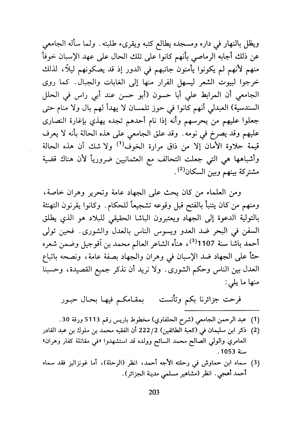 ويظل بالنهار في داره ومسجده يطالع كتبه ويقرئ طلبته. ولما سأله الجامعي عن ذلك أجابه الرماصي بأنهم كانوا على تلك الحال على عهد الإسبان خوفا منهم لأنهم لم يكونوا يأمنون جانبهم في الدور إذ قد يطرقونهم ليلا، لذلك خرجوا لبيوت الشعر ليسهل الفرار منها إلى الغابات والجبال. كما روى الجامعي أن المرابط علي أبا حسون (أبو حسن عند أبي راس في الحلل السندسية) العبدلي أنهم كانوا في حوز تلمسان لا يهدأ لهم بال ولا منام حتى جعلوا عليهم من يحرسهم وأنه إذا نام أحدهم تجده يهذي بإغارة النصارى عليهم وقد يصرخ في نومه. وقد علق الجامعي على هذه الحالة بأنه لا يعرف قيمة حلاوة الأمان إلا من ذاق مرارة الخوف (¬1) ولا شك أن هذه الحالة وأشباهها هي التي جعلت التحالف مع العثمانيين ضروريا لأن هناك قضية مشتركة بينهم وبين السكان (¬2).