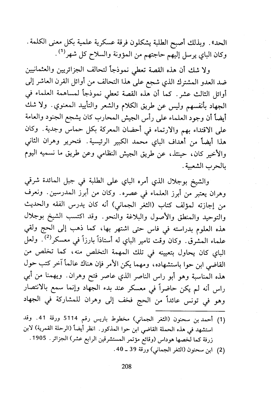 والشيخ بوجلال الذي أمره الباي على الطلبة في جبل المائدة شرقي وهران يعتبر من أبرز العلماء في عصره. وكان من أبرز المدرسين. ونعرف من إجازته لمؤلف كتاب (الثغر الجماني) أنه كان يدرس الفقه والحديث والتوحيد والمنطق والأصول والبلاغة والنحو. وقد اكتسب الشيخ بوجلال هذه العلوم بدراسته في فاس حتى اشتهر بها، كما ذهب إلى الحج ولقي علماء المشرق. وكان وقت تامير الباي له أستاذا بارزا في معسكر (¬2). ولعل الباي كان يحاول بتعيينه في تلك المهمة التخلص منه، كما تخلص من القاضي ابن حوا باستشهاده، ومهما يكن الأمر فإن هناك عالما آخر كتب حول هذه المناسبة وهو أبو راس الناصر الذي عاصر فتح وهران. ويهمنا من أبي راس أنه لم يكن حاضرا في معسكر عند بدء الجهاد وإنما سمع بالانتصار وهو في تونس عائدا من الحج فخف إلى وهران للمشاركة في الجهاد