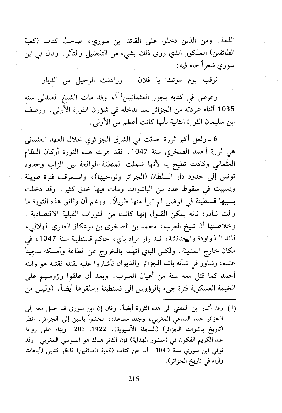 (¬1) وقد اشار ابن المفتي إلى هذه الثورة أيضا. وقال إن ابن سوري قد حمل معه إلى الجزائر جلد المدعي المغربي، وجلد مساعده، محشوا بالتبن إلى الجزائر. انظر (تاريخ باشوات الجزائر) (المجلة الآسيوية)، 1922، 203. وبناء على رواية عبد الكريم الفكون في (منشور الهداية) فإن الثائر هناك هو السوسي المغربي. وقد توفي ابن سوري سنة 1040. أما عن كتاب (كعبة الطائفين) فانظر كتابي (أبحاث