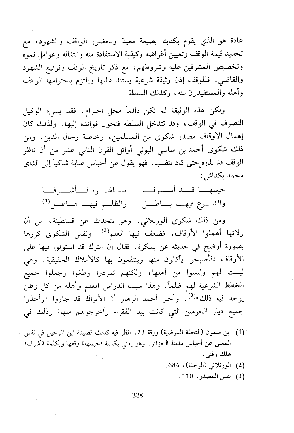 (¬1) ابن ميمون (التحفة المرضية) ورقة 23، انظر فيه كذلك قصيدة ابن آقوجيل في نفس المعنى عن أحباس مدينة الجزائر. وهو يعني بكلمة (حبسها) وقفها وبكلمة (أشرف) هلك وفنى.