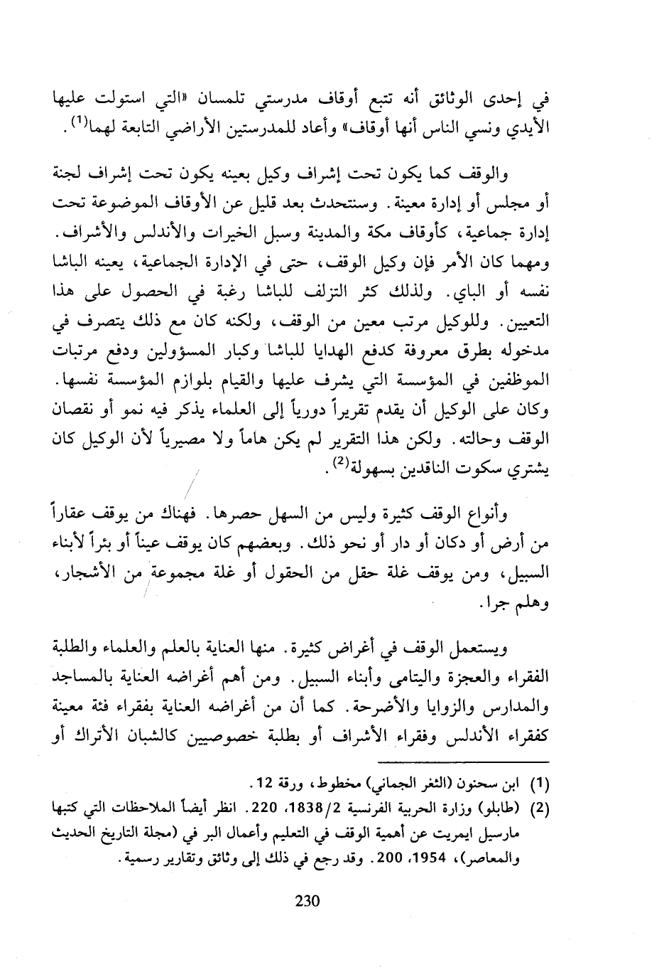 (¬2) (طابلو) وزارة الحربية الفرنسية 2/ 1838، 220. انظر أيضا الملاحظات التي كتبها مارسيل ايمريت عن أهمية الوقف في التعليم وأعمال البر في (مجلة التاريخ الحديث والمعاصر)، 1954، 200. وقد رجع في ذلك إلى وثائق وتقارير رسمية.