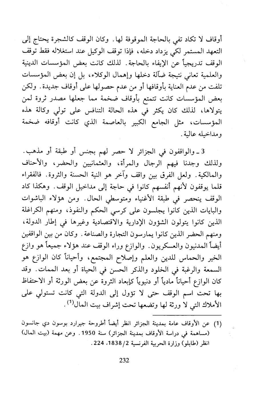 (¬1) عن الأوقاف عامة بمدينة الجزائر انظر أيضا أطروحة جيرارد بوسون دي جانسون (مساهمة في دراسة الأوقاف بمدينة الجزائر) سنة 1950. وعن مهمة (بيت المال) انظر (طابلو) وزارة الحربية الفرنسية 2/ 1838، 224.