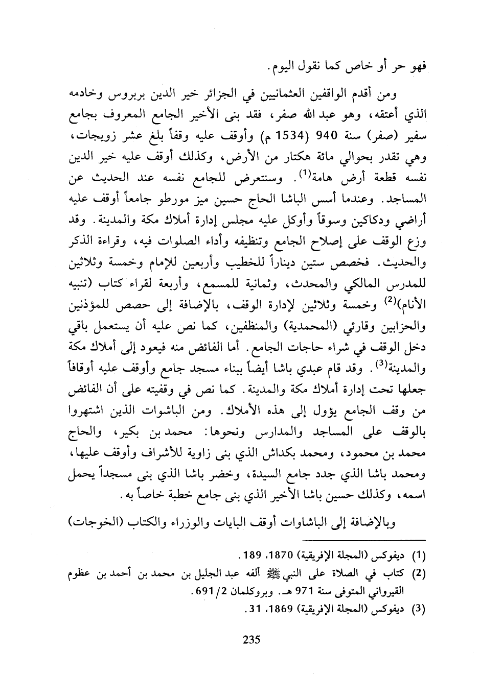 ومن أقدم الواقفين العثمانيين في الجزائر خير الدين بربروس وخادمه الذي أعتقه، وهو عبد الله صفر، فقد بنى الأخير الجامع المعروف بجامع سفير (صفر) سنة 940 (1534 م) وأوقف عليه وقفا بلغ عشر زويجات، وهي تقدر بحوالي مائة هكتار من الأرض، وكذلك أوقف عليه خير الدين نفسه قطعة أرض هامة (¬1). وسنتعرض للجامع نفسه عند الحديث عن المساجد. وعندما أسس الباشا الحاج حسين ميز مورطو جامعا أوقف عليه أراضي ودكاكين وسوقا وأوكل عليه مجلس إدارة أملاك مكة والمدينة. وقد وزع الوقف على إصلاح الجامع وتنظيفه وأداء الصلوات فيه، وقراءة الذكر والحديث. فخصص ستين دينارا للخطيب وأربعين للإمام وخمسة وثلاثين للمدرس المالكي والمحدث، وثمانية للمسمع، وأربعة لقراء كتاب (تنبيه الأنام) (¬2) وخمسة وثلاثين لإدارة الوقف، بالإضافة إلى حصص للمؤذنين والحزابين وقارئي (المحمدية) والمنظفين، كما نص عليه أن يتعمل باقي دخل الوقف في شراء حاجات الجامع. أما الفائض منه فيعود إلى أملاك مكة والمدينة (¬3). وقد قام عبدي باشا أيضا ببناء مسجد جامع وأوقف عليه أوقافا جعلها تحت إدارة أملاك مكة والمدينة. كما نص في وقفيته على أن الفائض من وقف الجامع يؤول إلى هذه الأملاك. ومن الباشوات الذين اشتهروا بالوقف على المساجد والمدارس ونحوها: محمد بن بكير، والحاج محمد بن محمود، ومحمد بكداش الذي بنى زاوية للأشراف وأوقف عليها، ومحمد باشا الذي جدد جامع السيدة، وخضر باشا الذي بنى مسجدا يحمل اسمه، وكذلك حسين باشا الأخير الذي بنى جامع خطبة خاصا به.