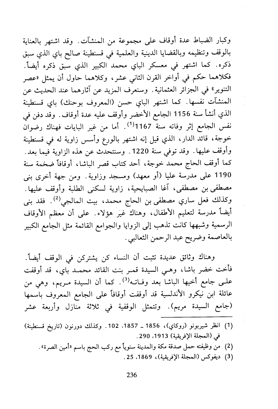 وكبار الضباط عدة أوقاف على مجموعة من المنشآت. وقد اشتهر بالعناية بالوقف وتنظيمه وبالقضايا الدينية والعلمية في قسنطينة صالح باي الذي سبق ذكره. كما اشتهر في معسكر الباي محمد الكبير الذي سبق ذكره أيضا. فكلاهما حكم في أواخر القرن الثاني عشر، وكلاهما حاول أن يمثل (عصر التنوير) في الجزائر العثمانية. وسنعرف المزيد عن آثارهما عند الحديث عن المنشآت نفسها. كما اشتهر الباي حسن (المعروف بوحنك) باي قسنطينة الذي أنشأ سنة 1156 الجامع الأخضر وأوقف عليه عدة أوقاف. وقد دفن في نفس الجامع إثر وفاته سنة 1167 (¬1). أما من غير البايات فهناك رضوان خوجة، قائد الدار، الذي قيل إنه اشتهر بالورع وأسس زاوية له في قسنطينة وأوقف عليها. وقد توفي سنة 1220. وسنتحدث عن هذه الزاوية فيما بعد. كما أوقف الحاج محمد خوجة، أحد كتاب قصر الباشا، أوقافا ضخمة سنة 1190 على مدرسة عليا (أو معهد) ومسجد وزاوية. ومن جهة أخرى بنى مصطفى بن مصطفى، آغا الصبايحية، زاوية لسكنى الطلبة وأوقف عليها. وكذلك فعل ساري مصطفى بن الحاج محمد، بيت المالجي (¬2). فقد بنى أيضا مدرسة لتعليم الأطفال، وهناك غير هؤلاء. على أن معظم الأوقاف الرسمية وشبهها كانت تذهب إلى الزوايا والجوامع القائمة مثل الجامع الكبير بالعاصمة وضريح عبد الرحمن الثعالبي.