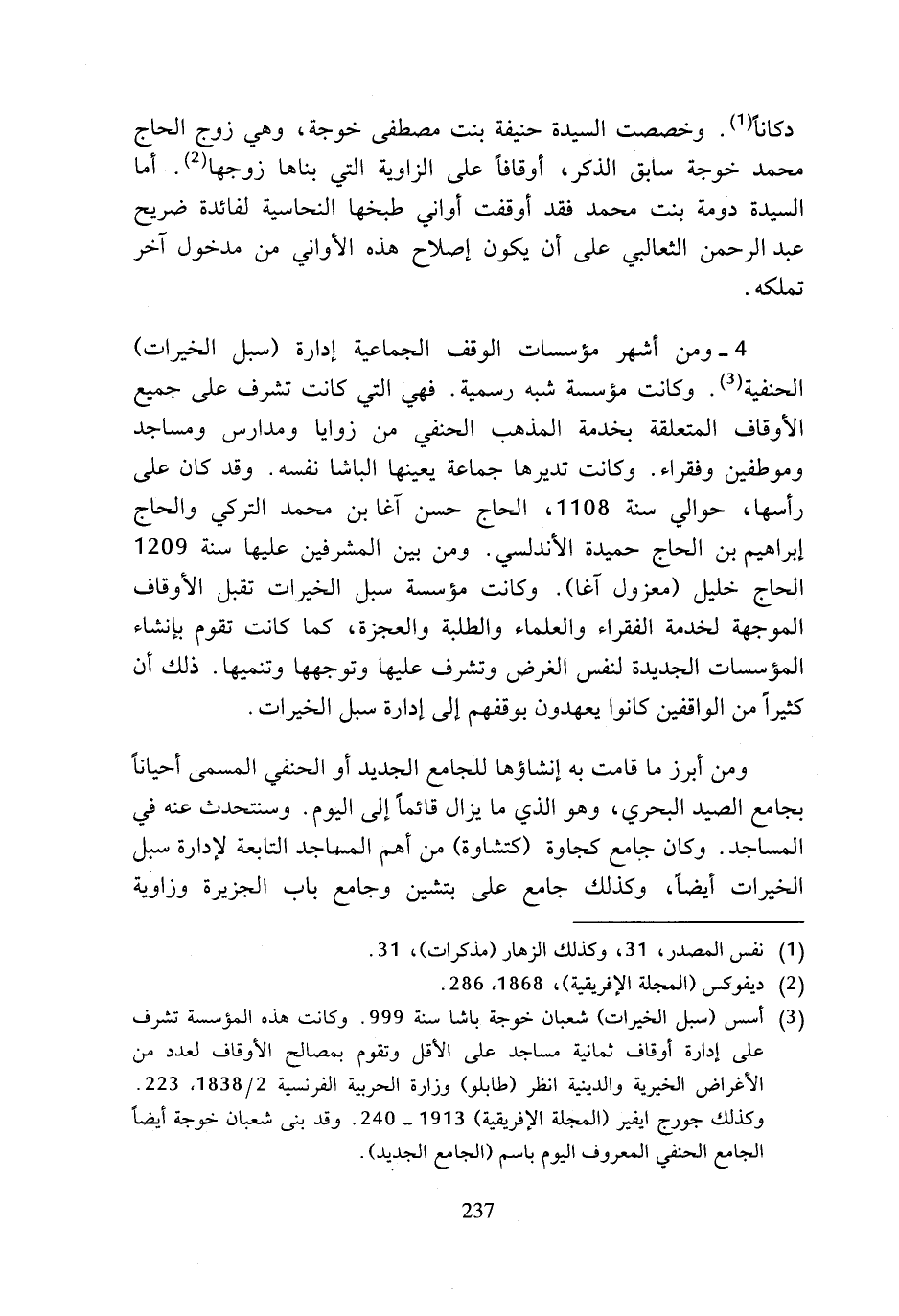 (¬3) أسس (سبل الخيرات) شعبان خوجة باشا سنة 999. وكانت هذه المؤسسة تشرف على إدارة أوقاف ثمانية مساجد على الأقل وتقوم بمصالح الأوقاف لعدد من الأغراض الخيرية والدينية انظر (طابلو) وزارة الحربية الفرنسية 2/ 1838، 223. وكذلك جورج ايفير (المجلة الإفريقية) 1913 - 240. وقد بنى شعبان خوجة أيضا الجامع الحنفي المعروف اليوم باسم (الجامع الجديد).