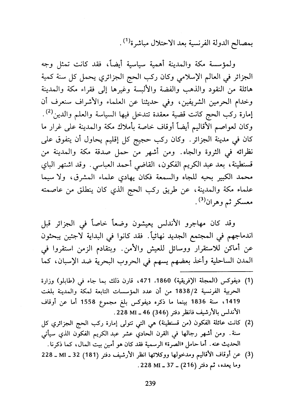 (¬1) ديفوكس (المجلة الإفريقية) 1860، 471، قارن ذلك بما جاء في (طابلو) وزارة الحربية الفرنسية 2/ 1838 من أن عدد المؤسسات التابعة لمكة والمدينة بلغت 1419، سنة 1838 بينما ما ذكره ديفوكس بلغ مجموع 1558 أما عن أوقاف الأندلس بالأرشيف فانظر دفتر (346) 46 - 228 MI .