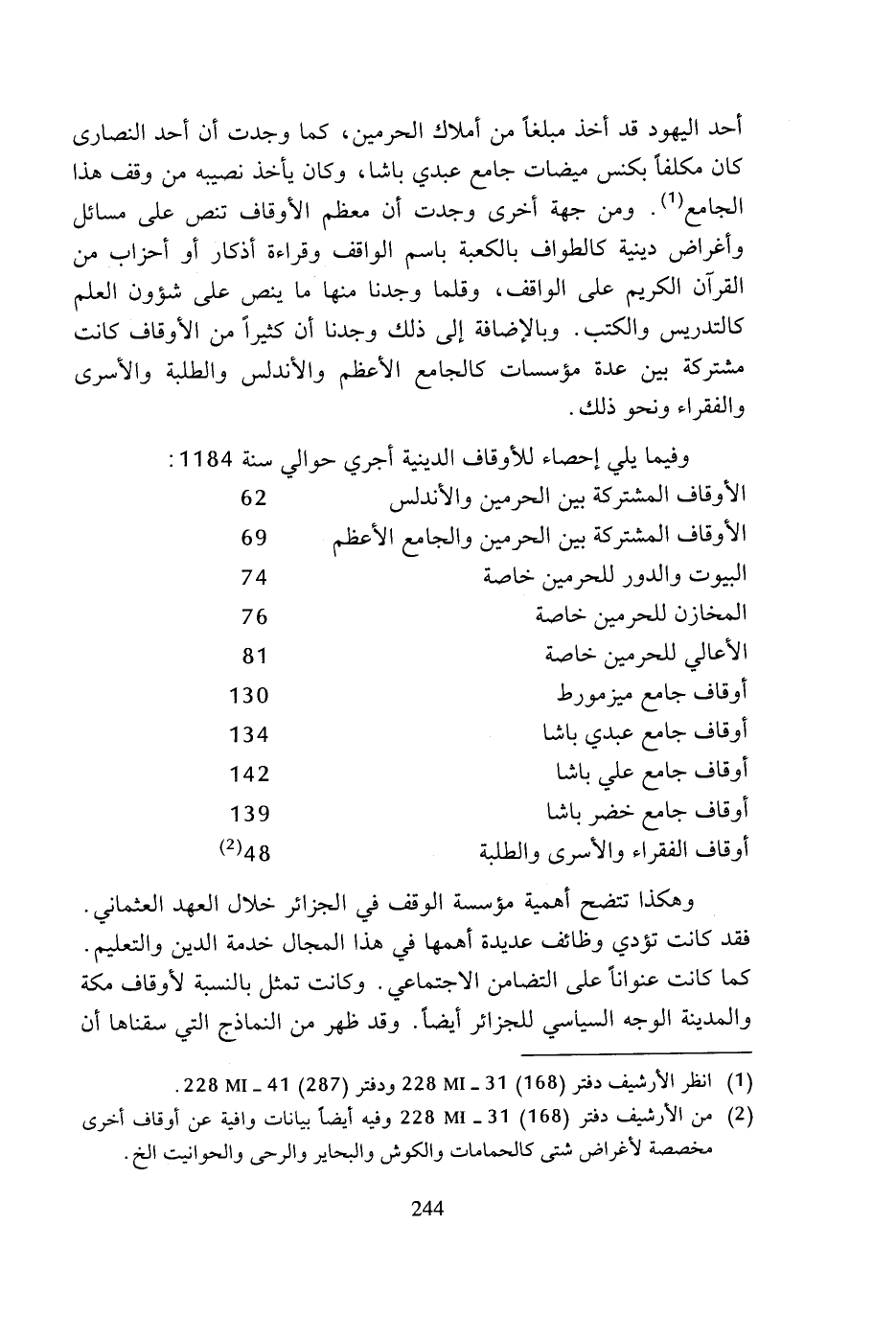 (¬2) من الأرشيف دفتر (168) 31 - 228 MI وفيه أيضا بيانات وافية من أوقاف أخرى مخصصة لأغراض شتى كالحمامات والكوش والبحاير والرحى والحوانيت الخ.