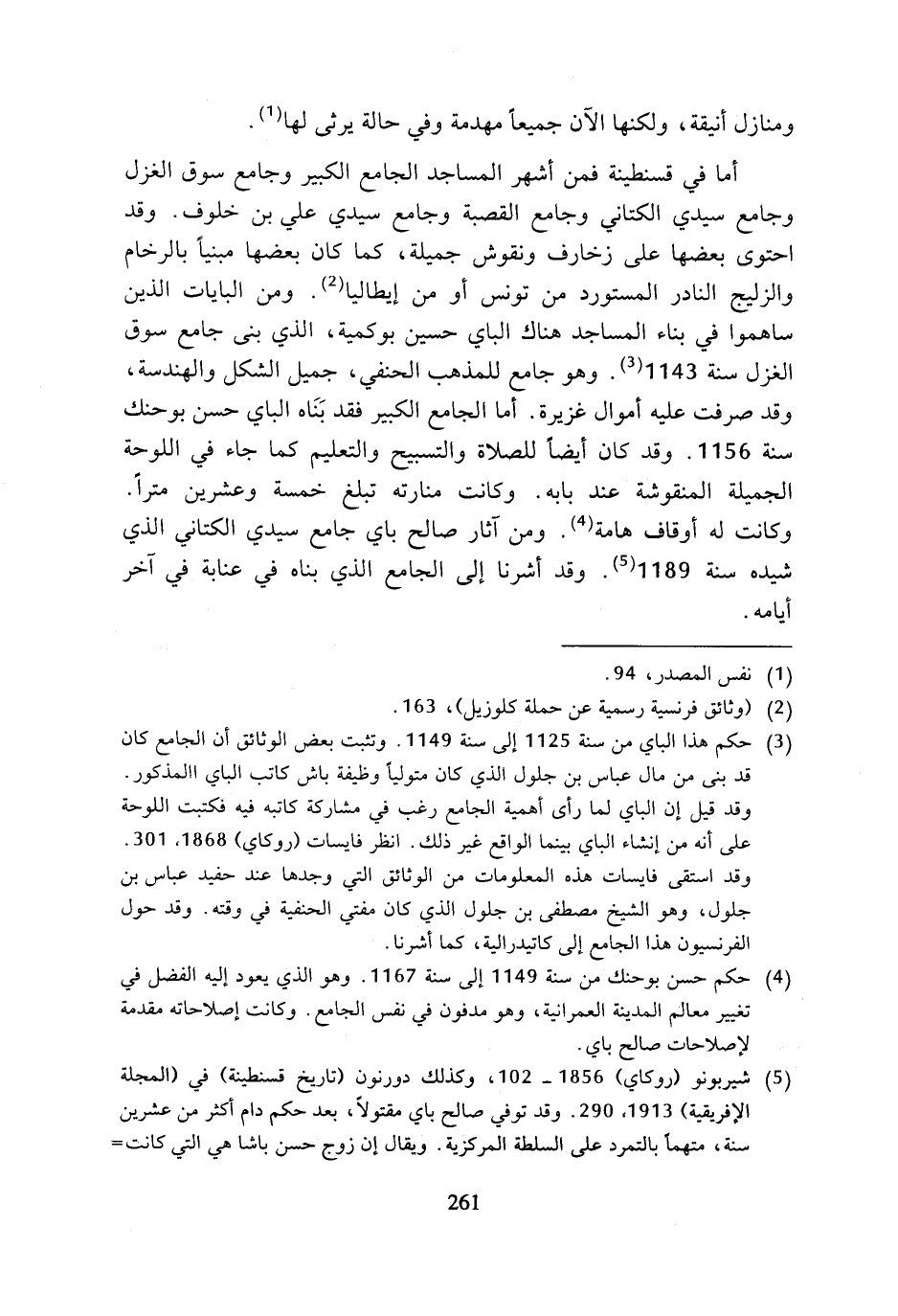 (¬3) حكم هذا الباي من سنة 1125 إلى سنة 1149. وتثبت بعض الوثائق أن الجامع كان قد بنى من مال عباس بن جلول الذي كان متوليا وظيفة باش كاتب الباي المذكور. وقد قيل إن الباي لما رأى أهمية الجامع رغب في مشاركة كاتبه فيه فكتبت اللوحة على أنه من إنشاء الباي بينما الواقع غير ذلك. انظر فايسات (روكاي) 1868، 301. وقد استقى فايسات هذه المعلومات من الوثائق التي وجدها عند حفيد عباس بن جلول، وهو الشيخ مصطفى بن جلول الذي كان مفتي الحنفية في وقته. وقد حول الفرنسيون هذا الجامع إلى كاتيدرالية، كما أشرنا.